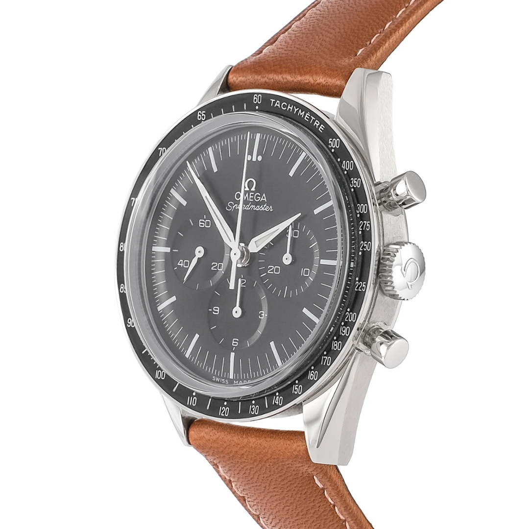An Omega Speedmaster, presented in stainless steel with a black dial and tachymetre bezel, paired with a brown leather strap for a more vintage-inspired aesthetic. The 40mm case offers slightly more compact proportions than the traditional Moonwatch, while retaining the iconic Speedmaster design language. The classic tri-compax chronograph layout, combined with aged-style hour markers and hands, gives this reference a subtle heritage feel with strong everyday versatility.