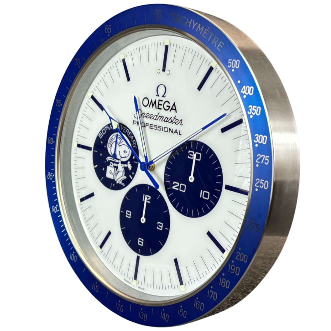 A stainless steel replica Omega Speedmaster Professional "Snoopy 50th Anniversary" Wall Clock. Measuring approximately 14 inches in height and width, this eye-catching timepiece features a bold white dial with rich blue accents and a tachymeter bezel, staying true to the iconic Speedmaster aesthetic.