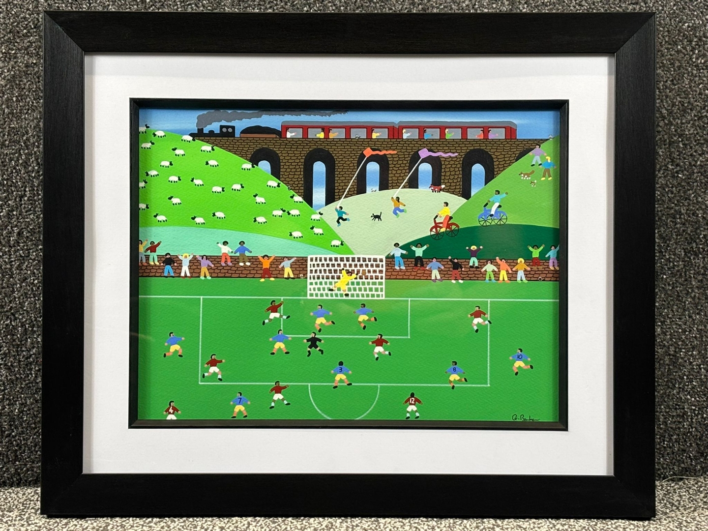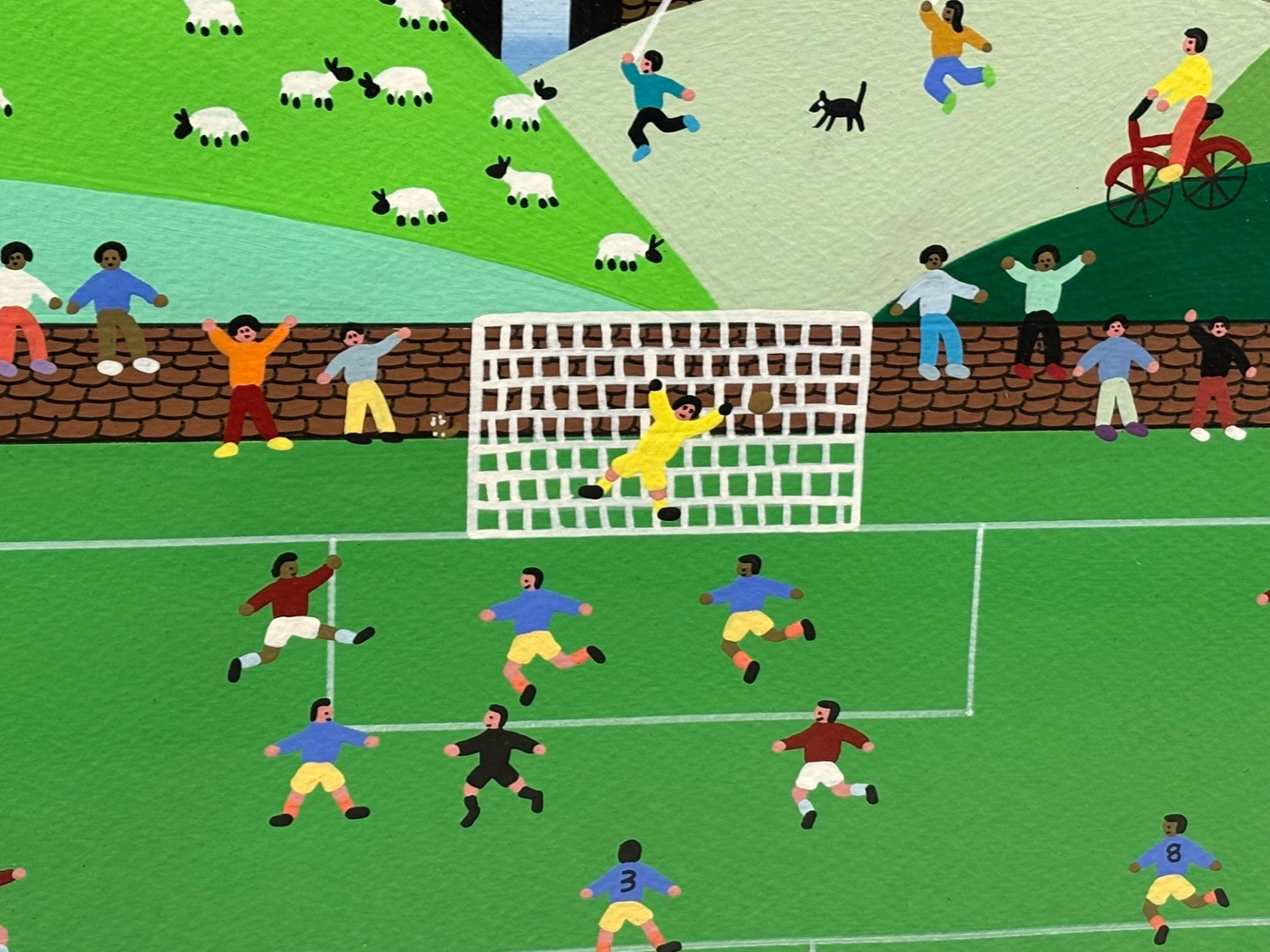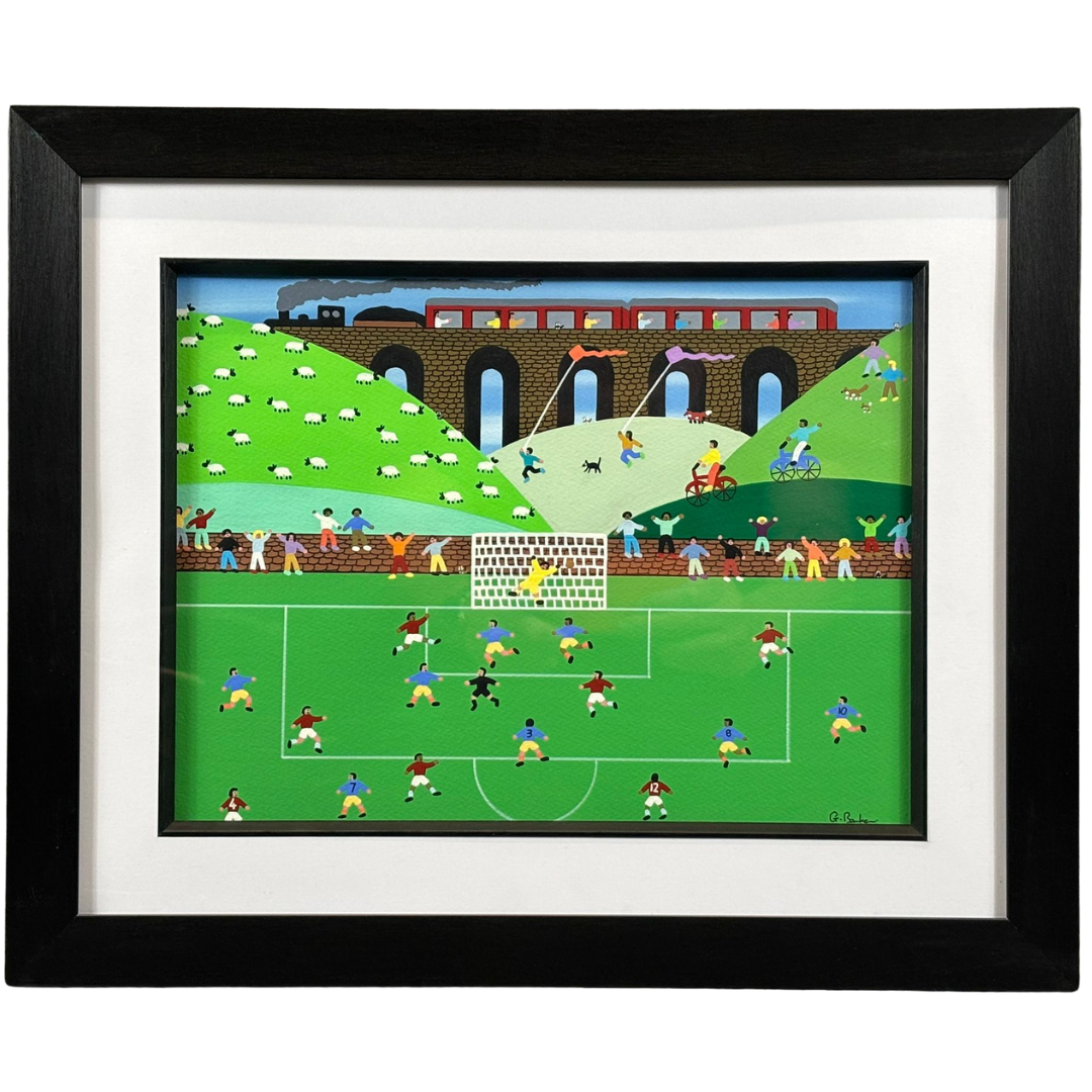 An original oil painting by celebrated artist Gordon Barker, Back Of The Net is a vibrant and energetic portrayal of football fever captured in Barker’s distinctive, colourful style. Measuring approximately 46cm in height and 56cm in width, including its bold black frame, this captivating artwork blends sporting drama with whimsical charm.