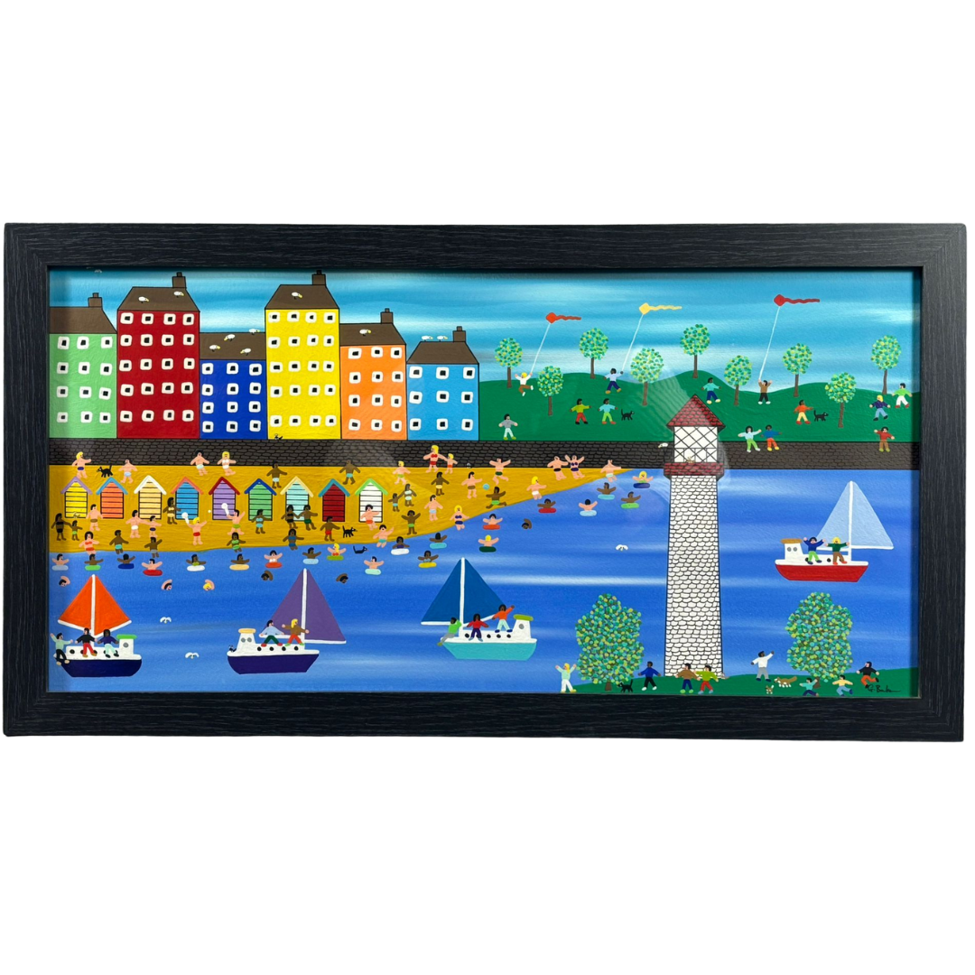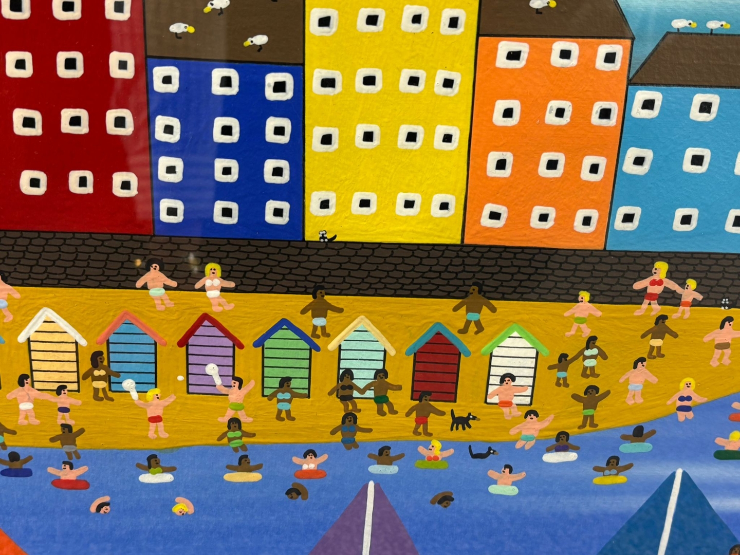 The scene depicts colourful beach huts, swimmers, paddle boarders,