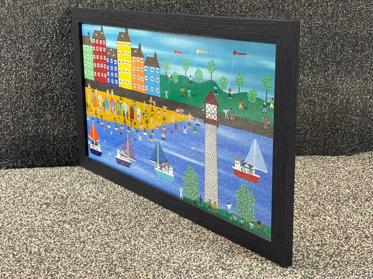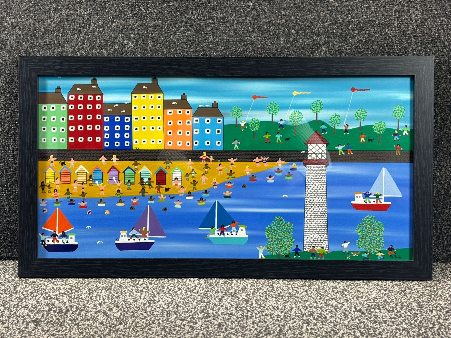 A framed original oil painting by the artist Gordon Barker titled 'Fun at the City Beach'. Approx 35cm height, 65cm width.