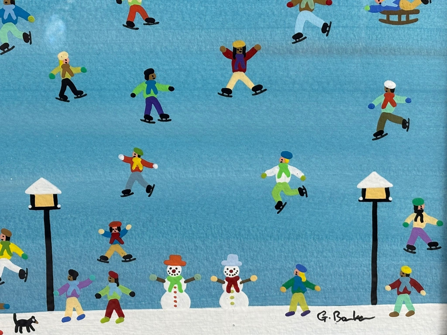 A lively original oil painting by British artist Gordon Barker, titled ‘Ice Skating’, presented in a sleek black frame and measuring approximately 35cm in height and 65cm in width. Barker’s distinctive naïve style has been developed over many years, with his work now featured in private and corporate collections across the world. His paintings are celebrated for their playful storytelling and instantly recognisable charm.