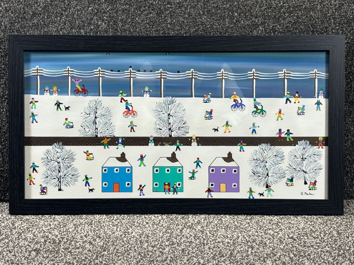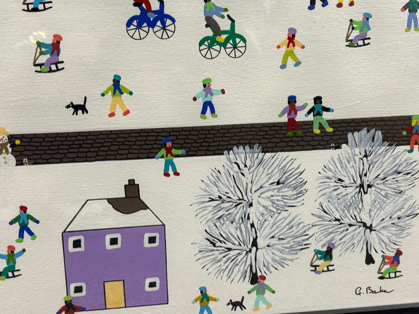 The painting depicts a stylised snowy landscape filled with