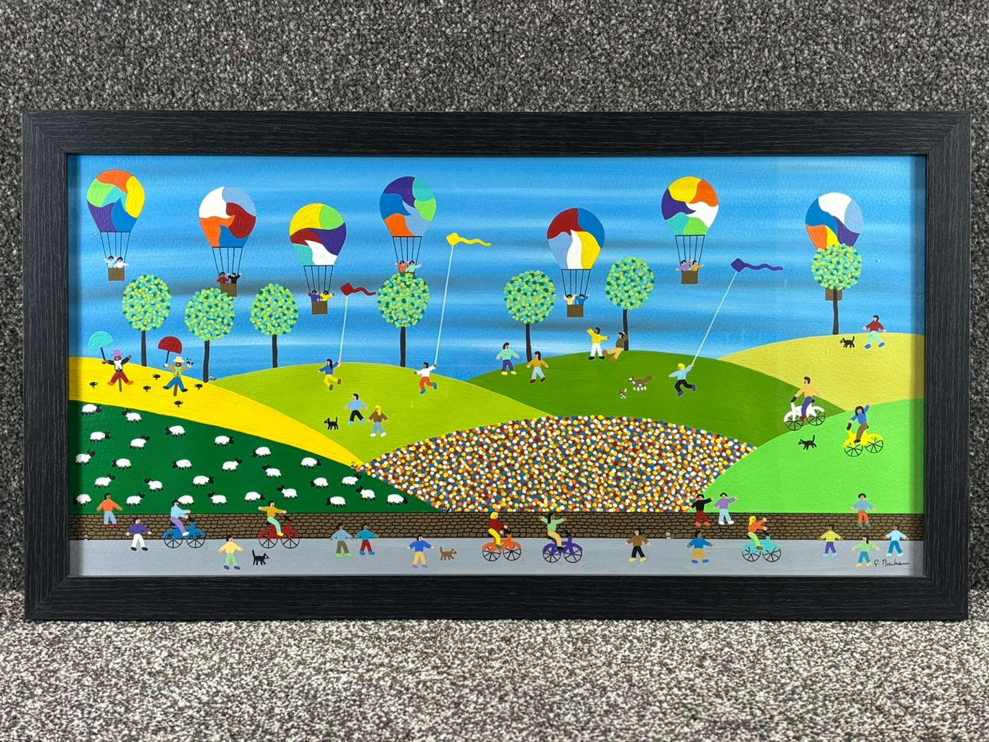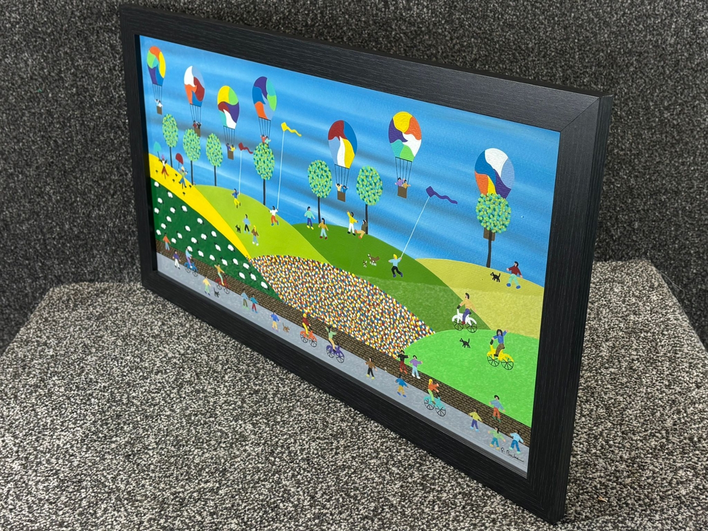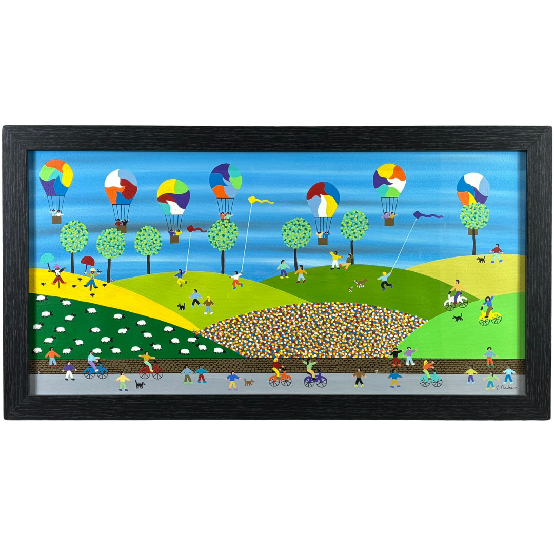 A lively countryside scene unfolds across rolling green hills, where figures stroll, cycle, and fly kites beneath a sky filled with colourful hot air balloons. A striking river of multicoloured dots winds through the landscape, while sheep graze peacefully on the surrounding slopes, adding charm and humour. The bold palette and simplified forms create a sense of movement and joy, drawing the viewer into the cheerful narrative.