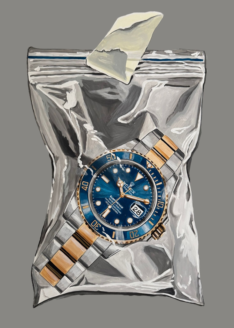 A bold and contemporary original painting by Liam Jacobi, capturing a striking juxtaposition between luxury and everyday imagery. The composition features a Rolex GMT watch encased within a sealed bag, set against a muted grey canvas background that enhances the contrast and draws immediate focus to the vibrant blue dial and two-tone bracelet. The hyper-realistic execution and attention to detail bring both the watch and surrounding textures to life.
