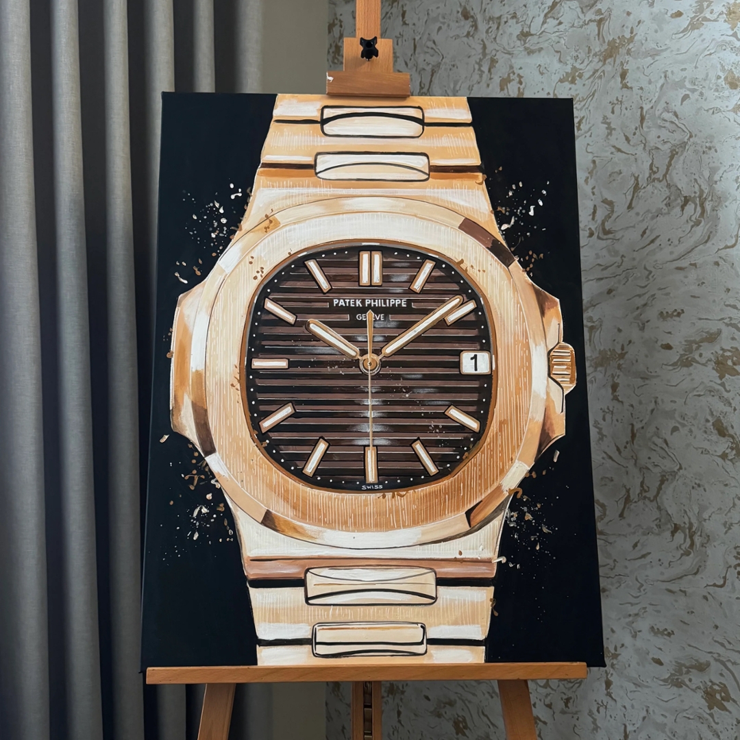 An original painting by the artist Liam Jacobi of a Gold Patek Philippe Watch.