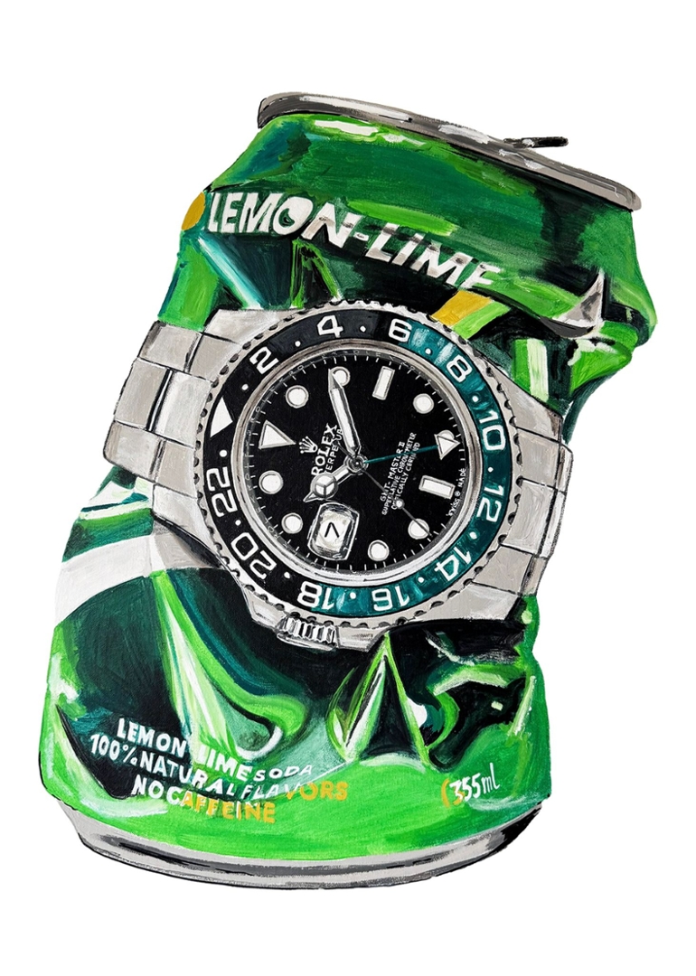A bold and contemporary original painting by Liam Jacobi, featuring the iconic Rolex GMT-Master II set against a vividly rendered crushed Sprite can. The composition merges luxury horology with everyday iconography, creating a striking visual contrast that immediately commands attention. The watch is depicted with sharp precision, its black dial and green-accented bezel harmonising seamlessly with the vibrant tones of the can.
