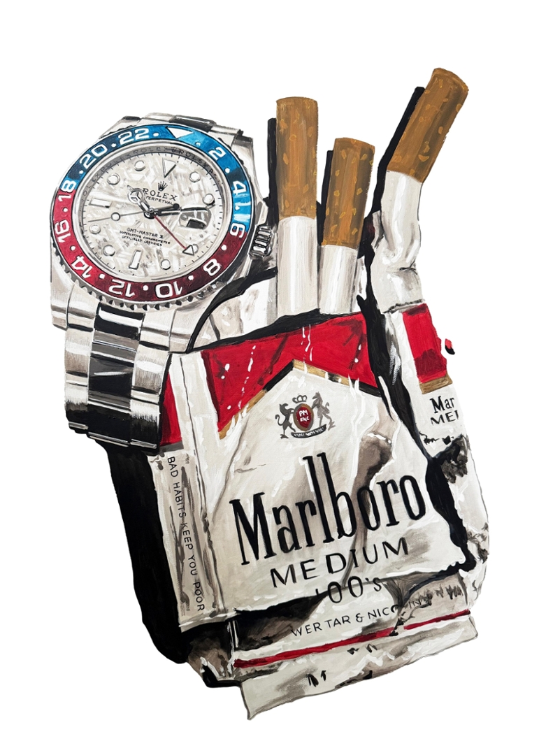 A bold and contemporary original painting by Liam Jacobi, featuring a striking Rolex GMT-Master II set against a vividly rendered pack of Marlboro cigarettes. The composition merges luxury horology with raw, everyday iconography, creating a powerful visual contrast that immediately commands attention. The watch is executed with sharp precision, showcasing its distinctive red and blue bezel, detailed dial, and steel bracelet against the worn textures of the packaging.