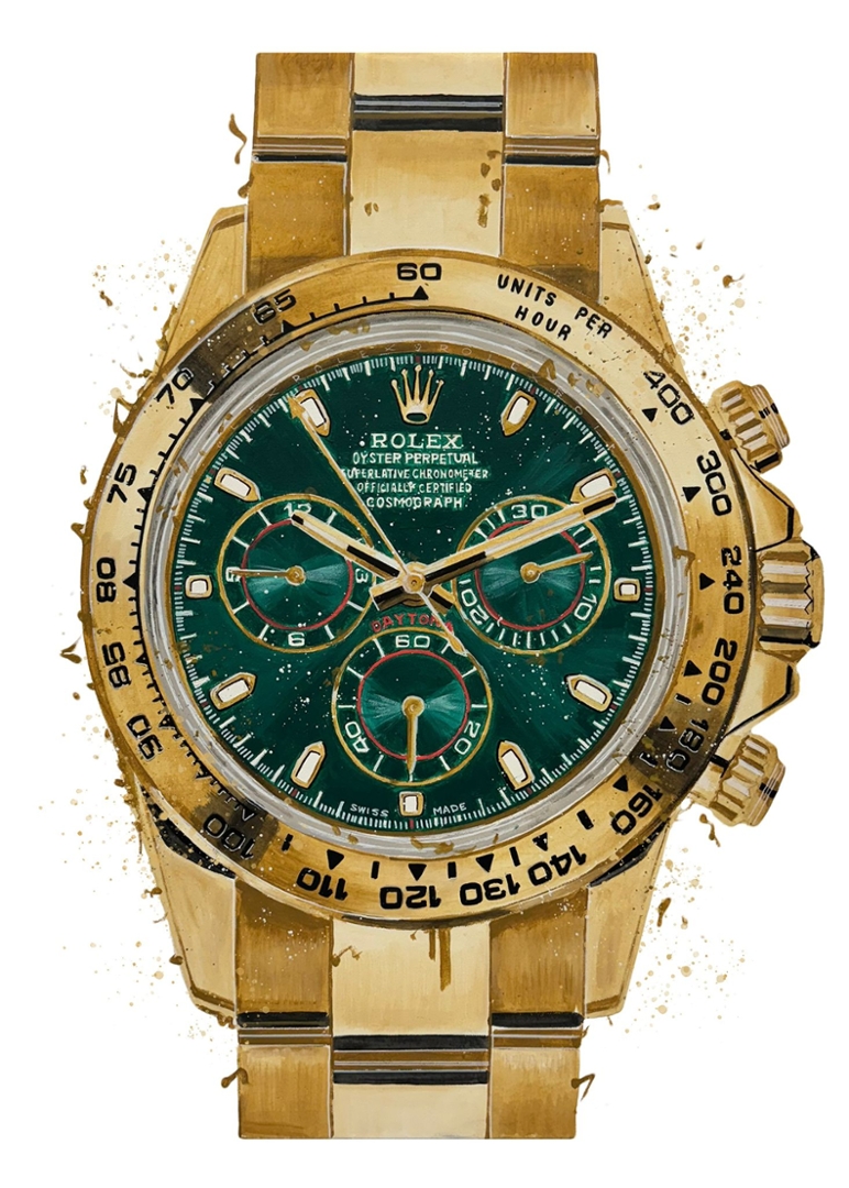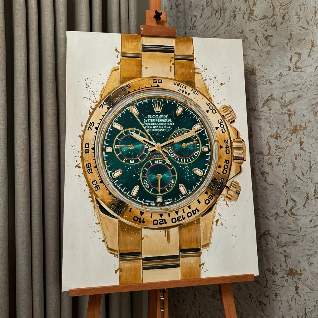 A striking original oil painting by Liam Jacobi, capturing the iconic Rolex “John Mayer” Daytona in rich gold tones with its unmistakable green dial. The composition emphasises the bold contrast between the warm case and the vibrant dial, while expressive brushwork and subtle splatter detailing introduce movement and a contemporary edge. The chronograph layout and tachymeter bezel are rendered with confident precision, celebrating one of the most recognisable modern Rolex references.