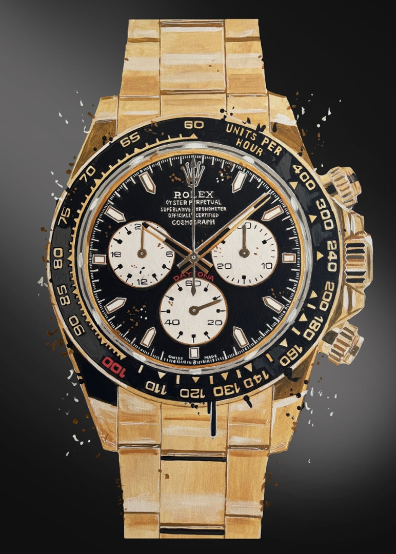 A striking original oil painting by Liam Jacobi, capturing the unmistakable presence of the Rolex Le Mans Daytona. Executed in warm gold tones against a deep, contrasting backdrop, the composition highlights the bold chronograph layout, tachymeter bezel, and distinctive dial details with confident, expressive brushwork. Subtle splatter accents and layered texture bring energy and movement, giving the piece a contemporary edge while celebrating one of Rolex’s most iconic designs.