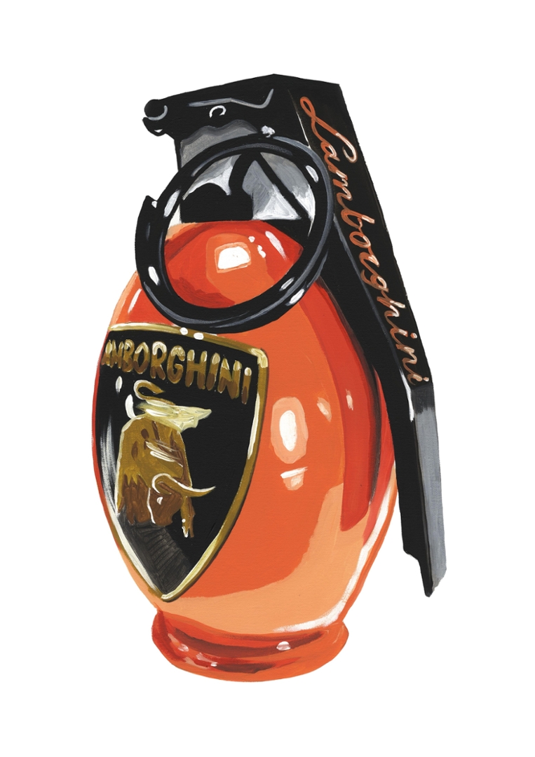 An original painting by the artist Liam Jacobi of an Orange Lamborghini Hand Grenade.