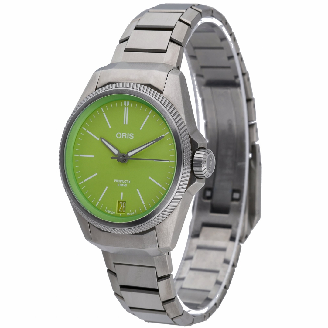 An Oris ProPilot X Kermit Edition reference 01 400 7778 7157 is presented in lightweight titanium, featuring a 39mm case paired with a matching titanium bracelet and the brand’s distinctive lift-style clasp. The watch is defined by its lime-green dial, accented with crisp applied indices and hands, and the playful Kermit date aperture at 6 o’clock, adding a subtle yet recognisable signature to the design. The fluted titanium bezel reinforces the ProPilot’s aviation-inspired aesthetic.