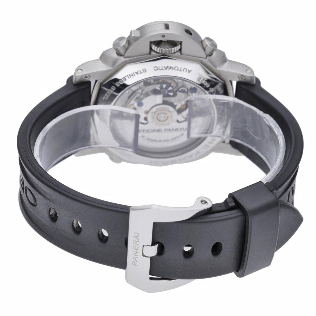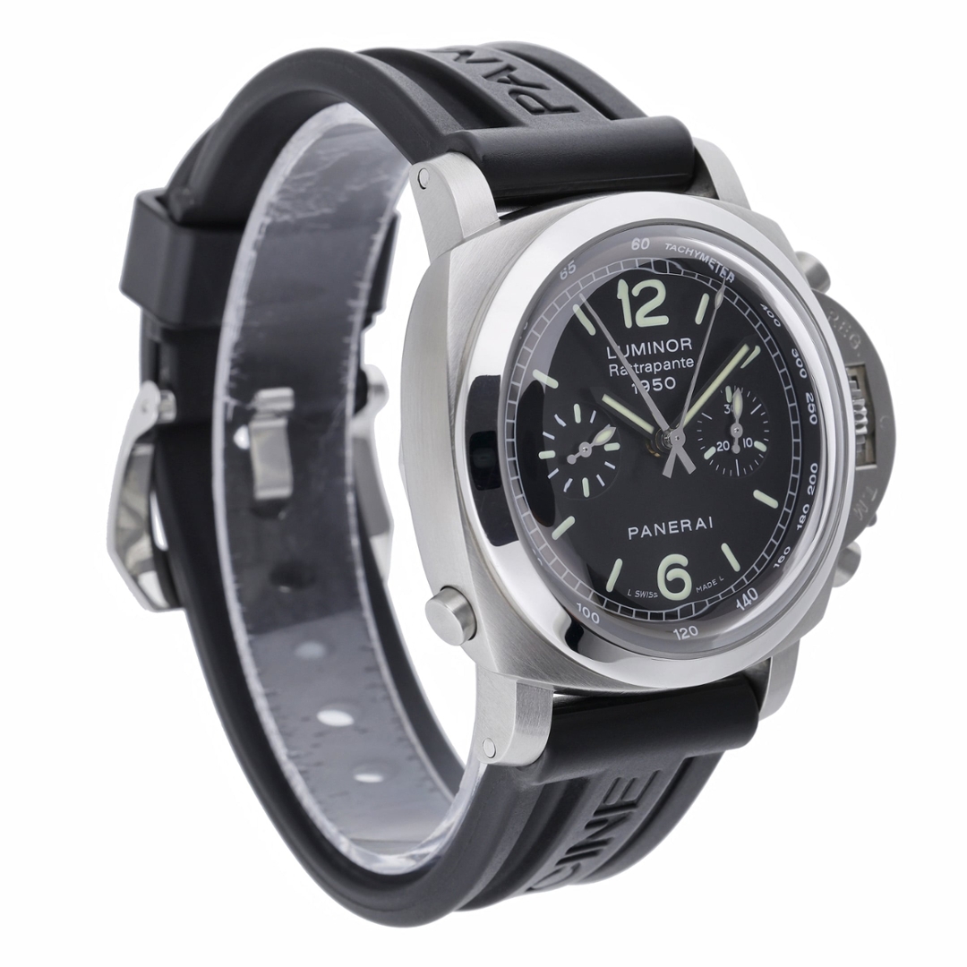 A Panerai Luminor 1950 Rattrapante Chronograph, reference PAM00213, in stainless steel showcases the bold, highly functional design language synonymous with the brand. The 44mm cushion-shaped case features the iconic crown-protecting bridge, delivering strong wrist presence and unmistakable identity, while the black strap complements its utilitarian, sport-driven aesthetic.