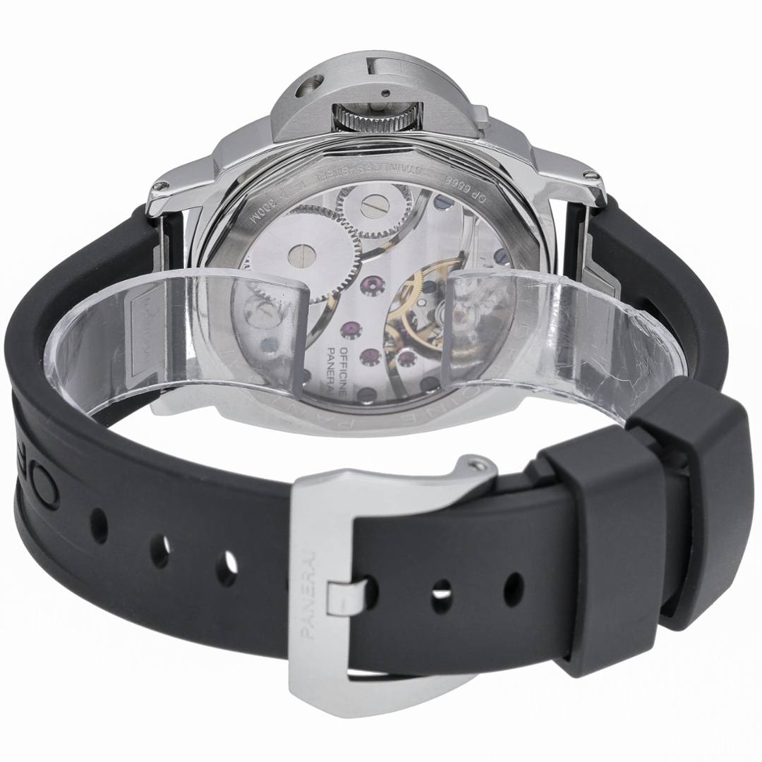 A Panerai Luminor Watch, Black Rubber Strap with a Stainless Steel Case & Clasp on a Black Dial.
