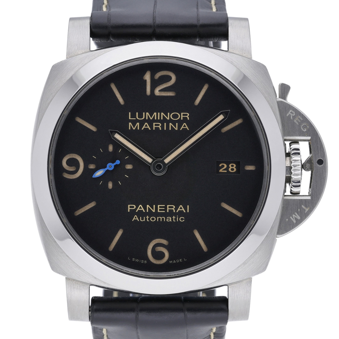 A Panerai Luminor Marina PAM01312, featuring Panerai’s iconic 44mm Luminor case paired with a clean, legible black sandwich dial. The warm-toned, luminous numerals and indices contrast beautifully against the dial, while the signature crown guard reinforces Panerai's unmistakable identity.