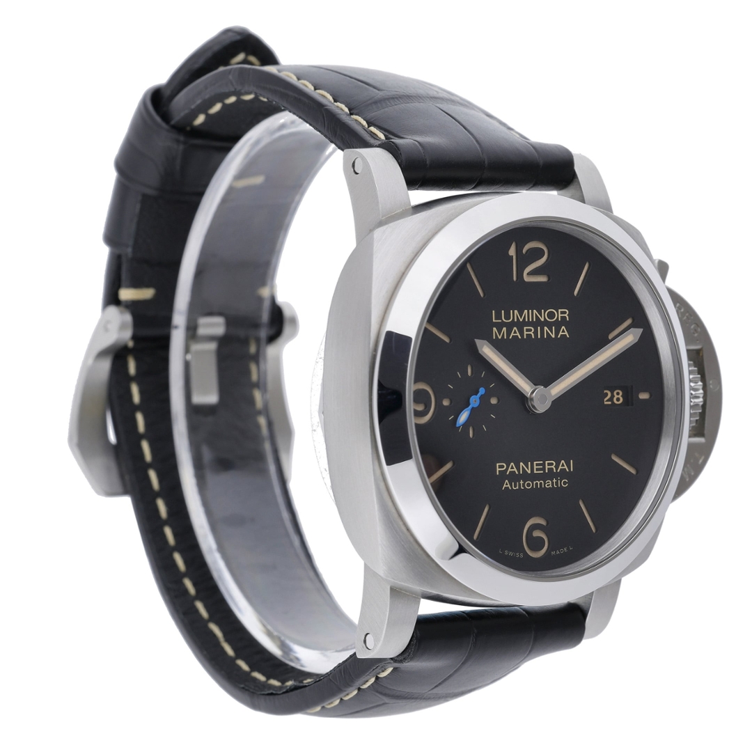 A Panerai Luminor Marina Watch, Black Leather Strap with a Stainless Steel Case and Clasp on a Black Dial.