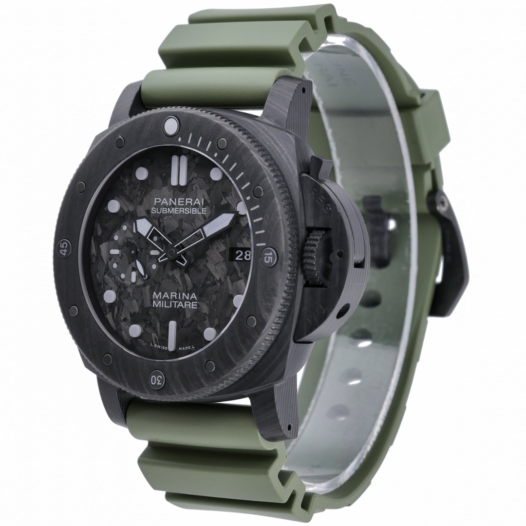 A Panerai Submersible Marina Militare is presented in a lightweight carbon composite case, paired with a green rubber strap and a matching carbon bezel. The 47mm case showcases Panerai’s signature crown-protecting bridge and robust dive-ready architecture, delivering commanding wrist presence. The black dial features a distinctive textured composite finish, luminous hour markers, bold hands, a date aperture at three o’clock, and a small seconds display at nine, ensuring exceptional legibility.