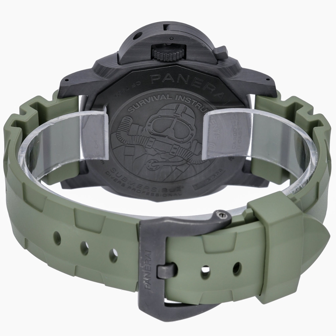 A Panerai Luminor Submersible Watch, Green Rubber Strap with a Carbon Case and Clasp/Bezel on a Black Dial
