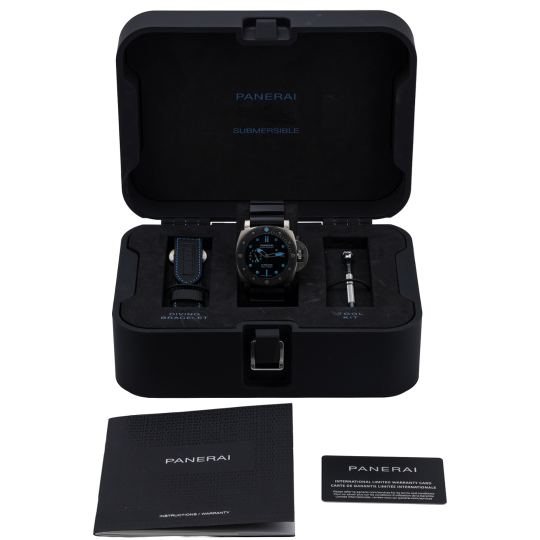 A Panerai Luminor Submersible Watch, reference PAM00799, presented in immaculate condition, with a bold, highly functional dive-watch design. The 47mm titanium case delivers a strong yet lightweight presence on the wrist, paired with a black rubber strap for comfort and durability in active use. The black dial features luminous blue-accented markers and hands, ensuring exceptional legibility, while the unidirectional rotating bezel enhances its practical diving functionality.