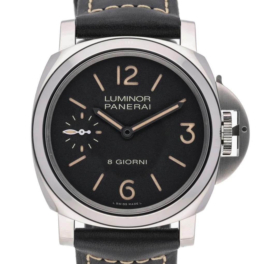 A Panerai Luminor PAM00915 is presented on a black leather strap with a stainless-steel case and matching clasp, offering the bold and instantly recognisable aesthetic of the Luminor line. The 44mm case features Panerai’s signature crown-protecting bridge, while the black dial incorporates luminous Arabic numerals and batons for excellent clarity. Its clean layout and strong legibility make it a practical choice for everyday wear.