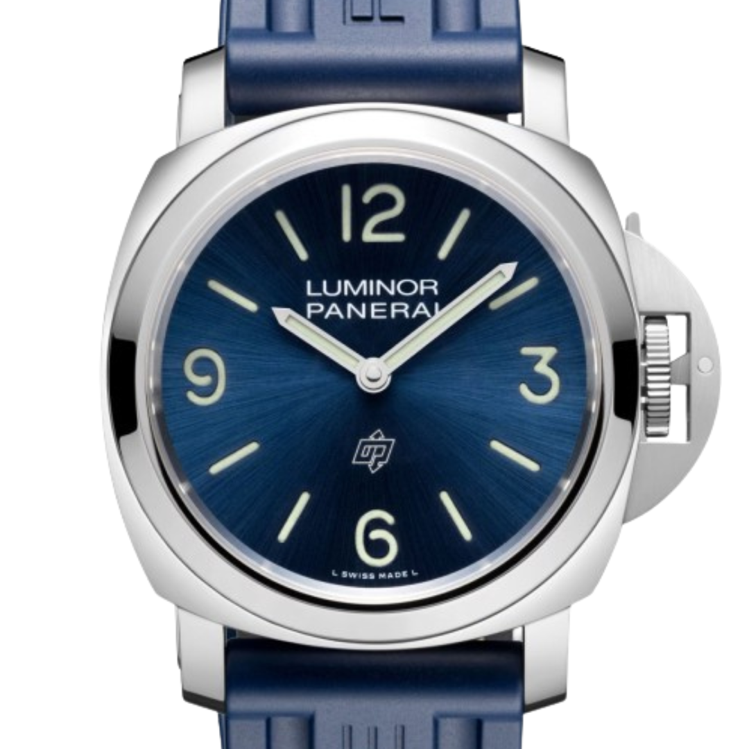 A Panerai Luminor PAM01623 featuring a stainless steel case paired with a striking blue sunburst dial and a matching blue rubber strap. The signature Luminor crown guard and clean, highly legible dial layout deliver the bold, utilitarian aesthetic Panerai is known for, while the rich blue tones add a modern and distinctive edge.