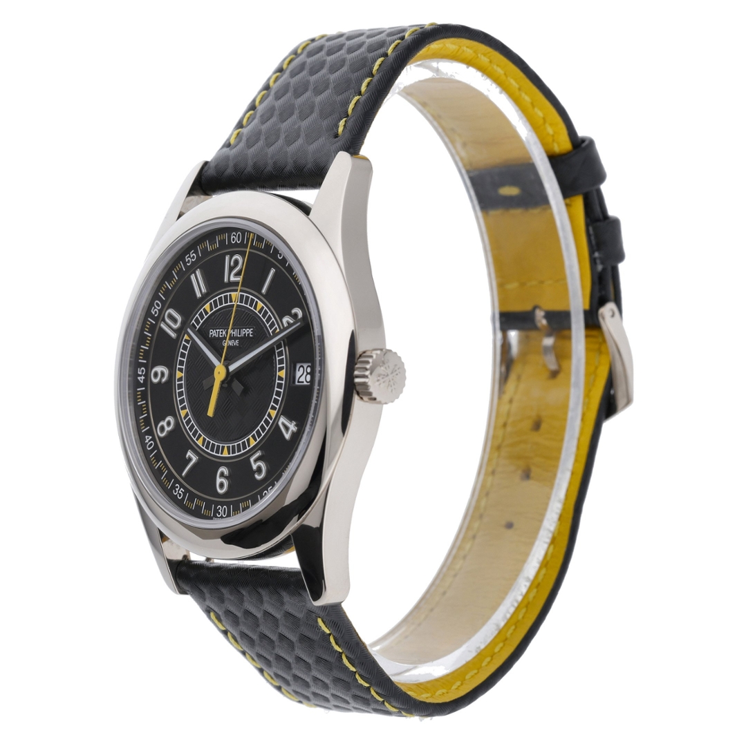 A Patek Philippe Calatrava, reference 6007G-001, is a striking interpretation of Patek’s timeless design language infused with contemporary flair. Crafted from 18ct white gold, this 40mm model features a textured black dial enhanced by luminous Arabic numerals, vibrant yellow accents, and a fine guilloché centre — an elegant nod to the brand’s meticulous craftsmanship. The black calfskin strap, detailed with matching yellow stitching, adds a modern and sporty edge to the classic Calatrava silhouette.