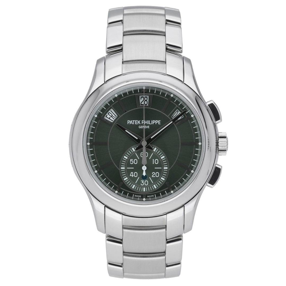 A Patek Philippe Annual Calendar Chronograph reference 5905/1A-001 is a contemporary expression of the manufacture’s technical mastery. Crafted from stainless steel, the 42mm case pairs with an integrated bracelet and a rich green sunburst dial, offering a distinctive yet refined presence on the wrist.