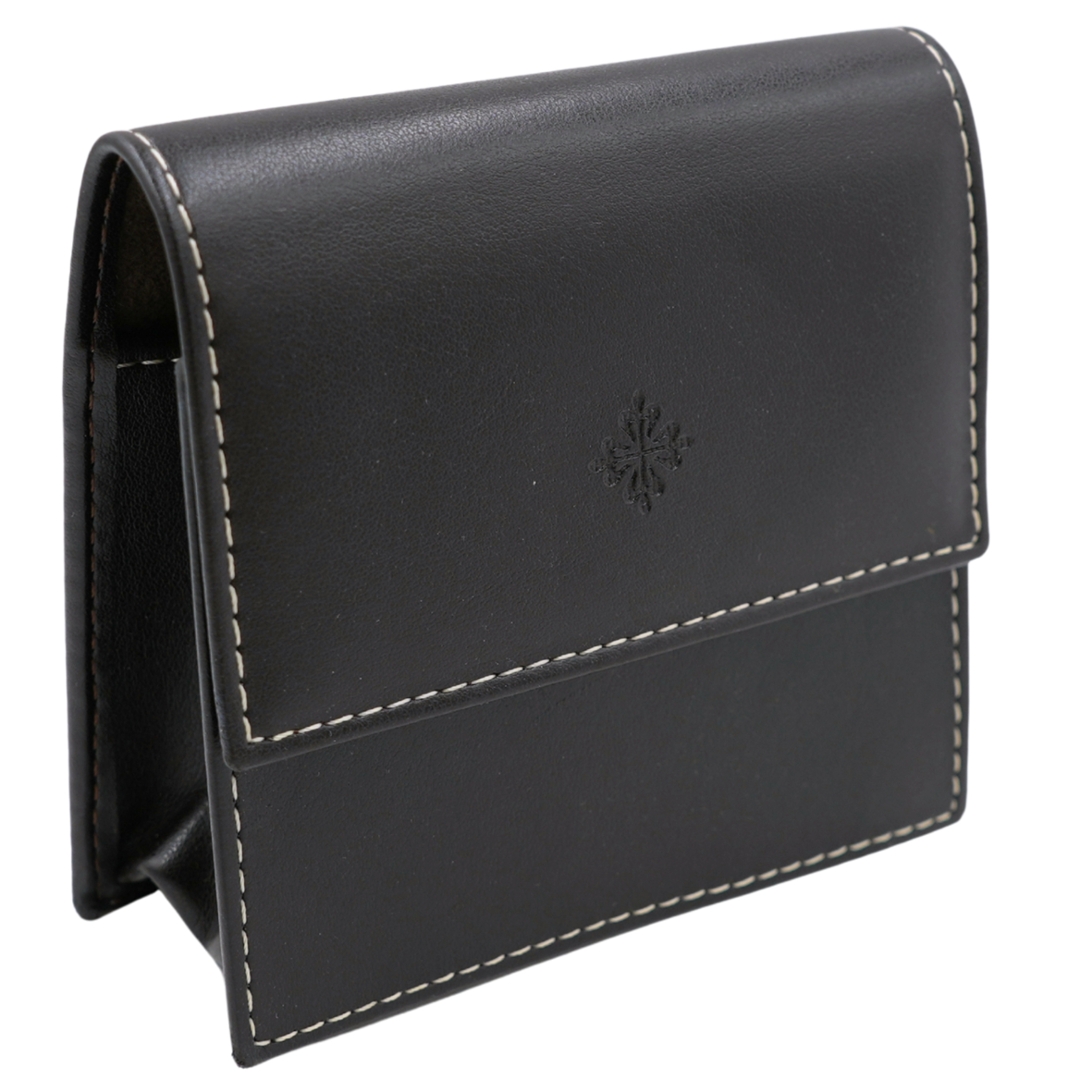 A Patek Philippe square travel case crafted in smooth black leather, reflecting the maison’s understated approach to functional luxury accessories. The exterior presents a clean, structured silhouette with contrasting light stitching and a discreetly embossed Calatrava cross to the flap, offering subtle brand recognition while maintaining a timeless, elegant appearance.