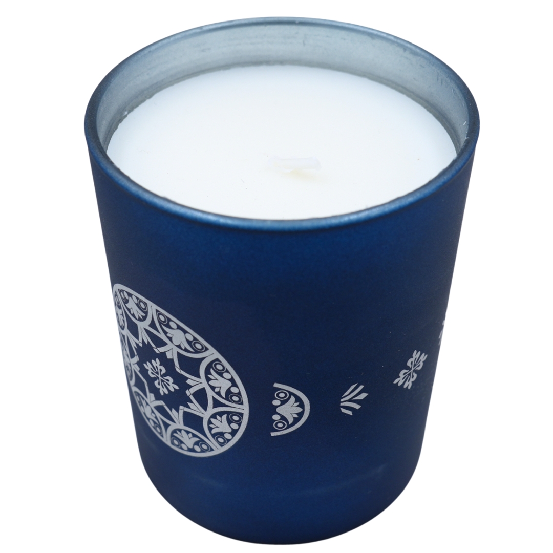 A Patek Philippe scented candle presented in a deep blue frosted glass vessel, showcasing the brand’s elegant aesthetic beyond watchmaking. The exterior is adorned with delicate white motifs inspired by traditional decorative patterns, subtly incorporating elements of the Calatrava cross for discreet brand recognition. The rich blue tone lends a calm, sophisticated presence suitable for both contemporary and classic interiors.