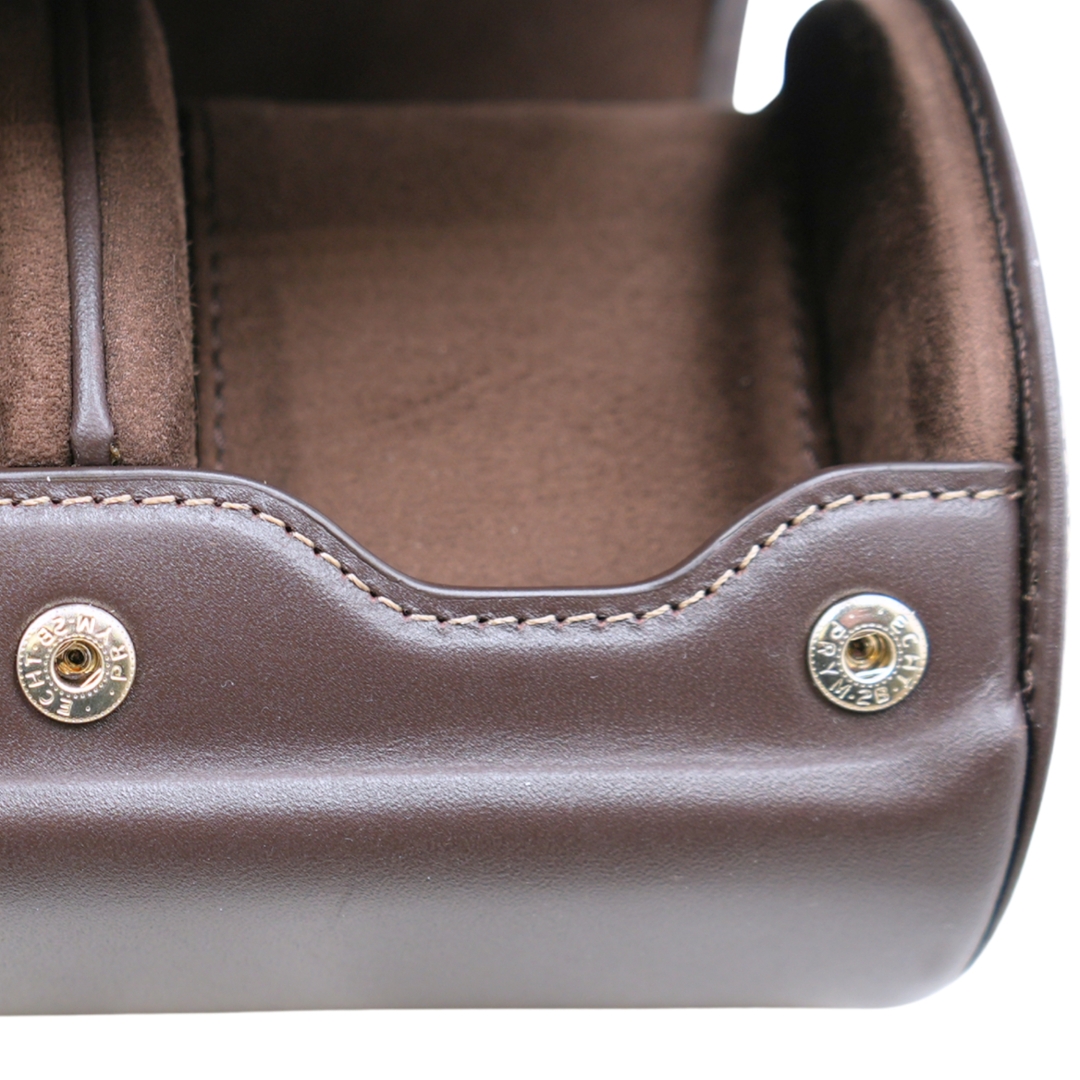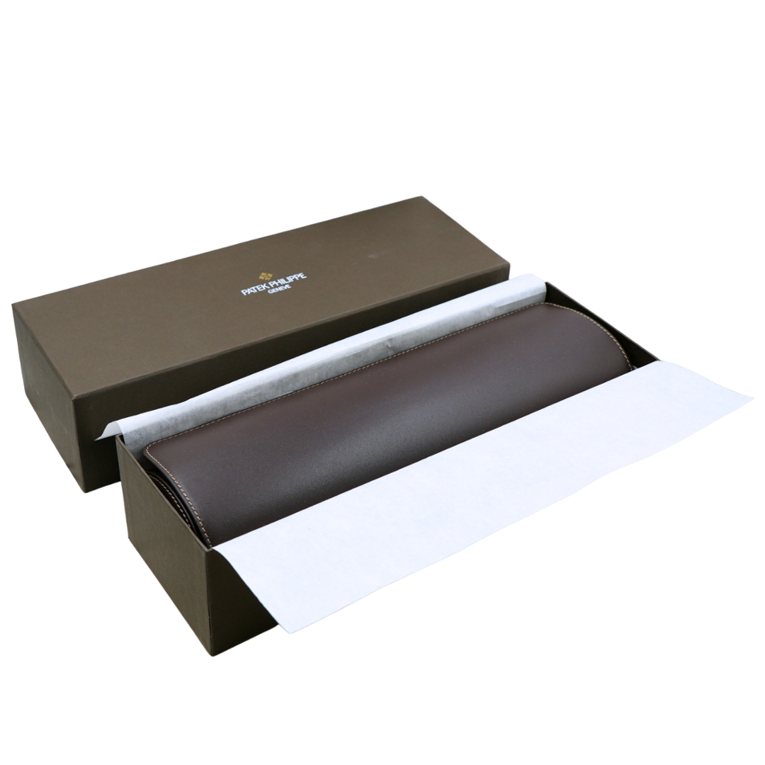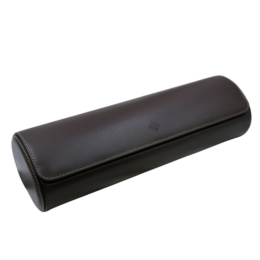 A Patek Philippe watch holder designed to store and present up to four wristwatches, crafted in rich brown leather with a softly contoured profile. The exterior showcases the maison’s understated luxury, with smooth leather panels, fine stitching, and a structured roll design that balances elegance with practicality. Subtle Patek Philippe Genève branding inside reinforces its association with one of watchmaking’s most prestigious names.