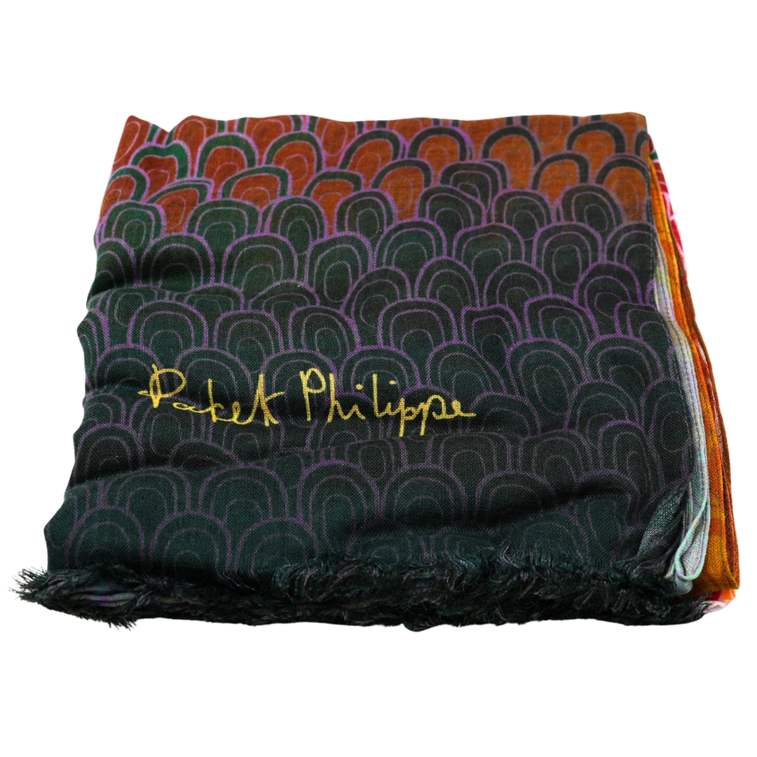A Patek Philippe scarf featuring a rich brown base accented by layered tones of green, orange, and soft pink, arranged in a repeating scalloped pattern. The design reflects the maison’s elegant visual language, translating its heritage and attention to detail into a distinctive yet understated accessory. A subtle Patek Philippe signature is woven into the fabric, providing discreet brand recognition.
