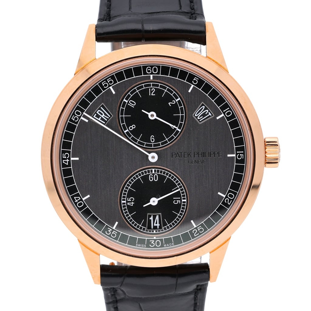 A Patek Philippe Complications Watch, model 5235/50R-001, presented in immaculate condition. Crafted in 18ct rose gold, this 2023 reference features a distinctive grey dial with a regulator-style display, showcasing central minutes with offset hour and seconds subdials. Housed in a 40mm case and paired with a leather strap, it is powered by the manually wound Patek Philippe Calibre 31-260 REG QA movement. The watch is offered with its original Patek Philippe paperwork, presentation box, and a 12-month WLC warranty.