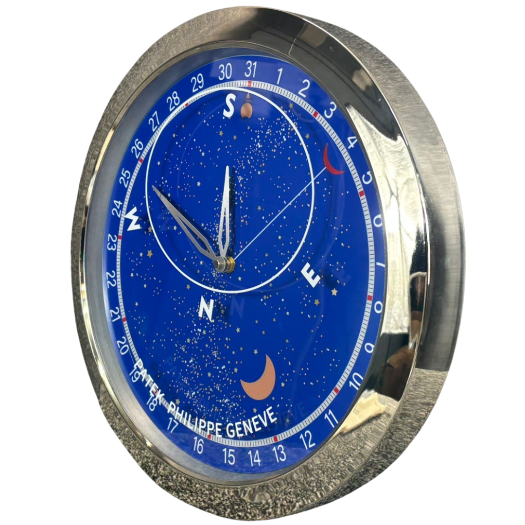 A stainless steel replica of the Patek Philippe Grand Complications Celestial Moon Age Wall Clock. Inspired by one of the most iconic masterpieces in haute horology, this exquisite wall clock captures the magic of the night sky with a captivating star chart, moon phase display, and cardinal directions. Encased in a lustrous stainless steel finish. Measuring approximately 14 inches in both height and width, this commanding piece makes a bold statement in any luxury interior. The rich midnight-blue dial is adorned with golden stars, a crescent moon, and elegant silver-tone hands, creating a mesmerising visual reminiscent of the original platinum Patek Philippe design. Whether displayed in an office, study, or boutique setting, this clock is sure to turn heads and ignite conversation. A perfect blend of astronomical beauty and horological tribute, ideal for collectors and design enthusiasts alike.