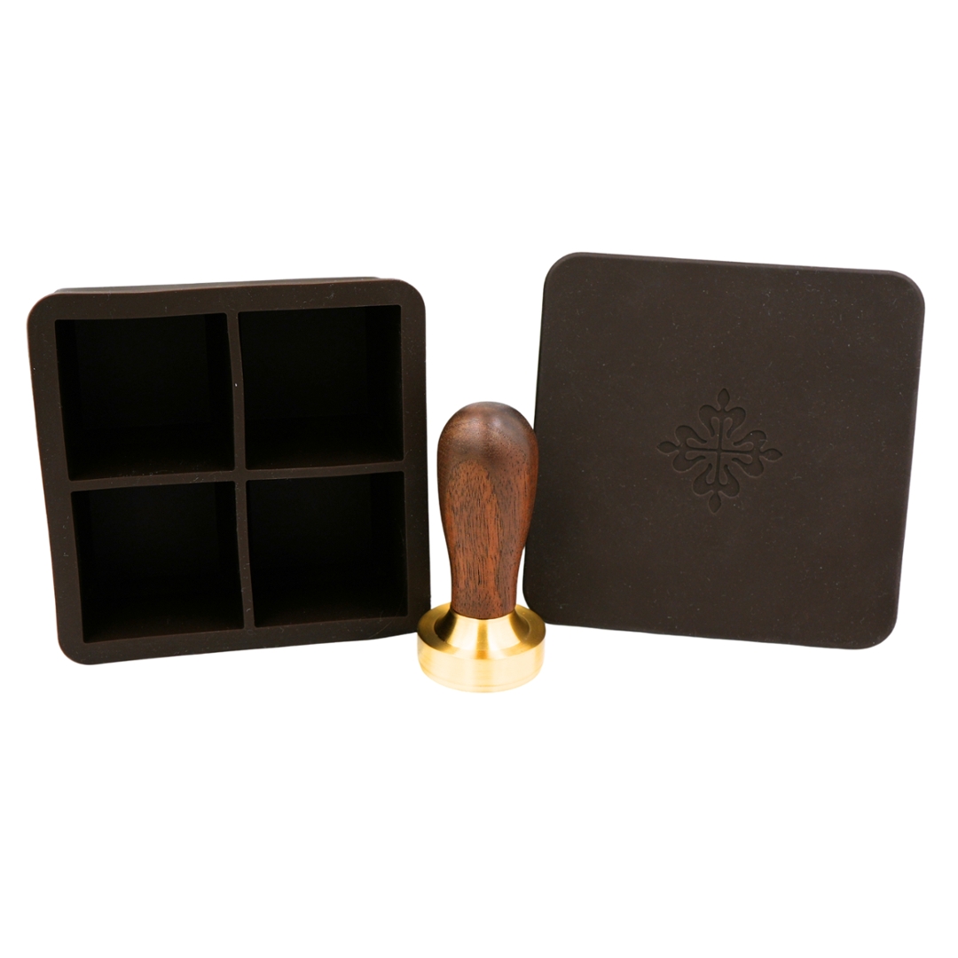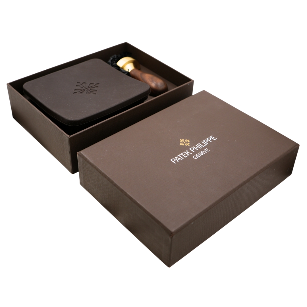 The mould is divided into four square compartments and is finished with a matching lid, also embossed with the Calatrava cross motif. The stamp head features fine engraved detail, reinforcing the brand's quality and precision. This set reflects Patek Philippe’s understated approach to exclusivity beyond watchmaking.