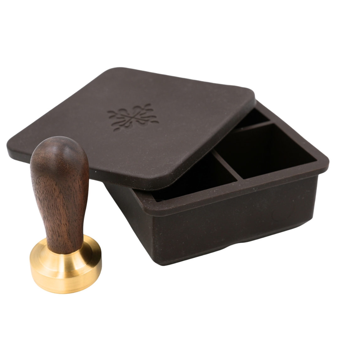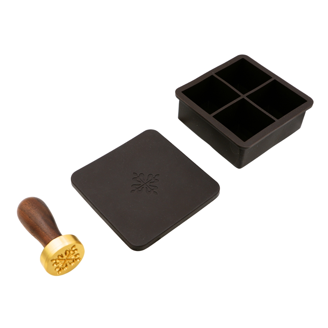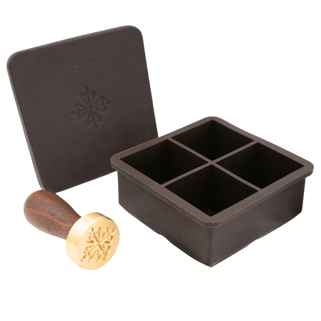 A distinctive Patek Philippe ice cube maker set, combining refined presentation with playful brand detailing. Crafted for the maison as a luxury lifestyle accessory, the set includes a dark mould tray designed to produce neatly formed ice cubes, accompanied by a solid stamp finished with a wooden handle and gold-tone head. The stamp features the iconic Calatrava cross, allowing each cube to be impressed with the unmistakable Patek Philippe emblem.