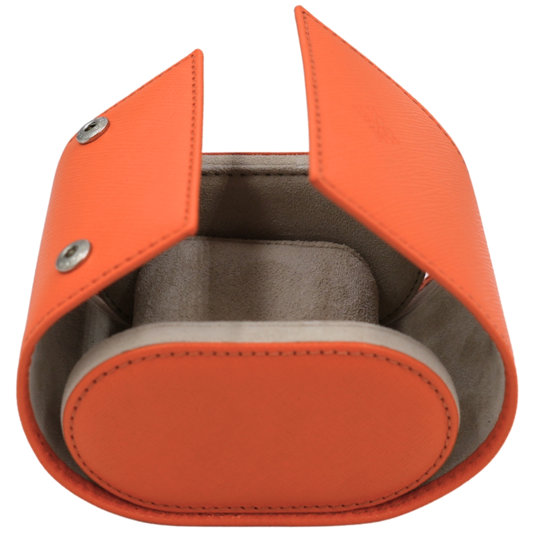 A Patek Philippe watch travel case crafted in vibrant orange textured leather, offering a bold yet refined take on the maison’s luxury accessories. The exterior presents a compact, structured silhouette with clean stitching and a subtly embossed Calatrava cross on the flap, providing understated brand detail against the striking colour. Designed for secure travel, the snap-button closure keeps the case securely closed in use.