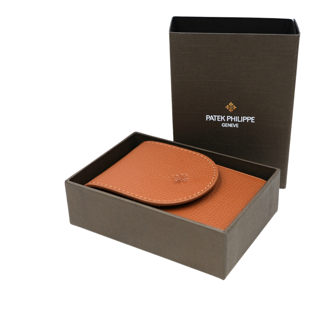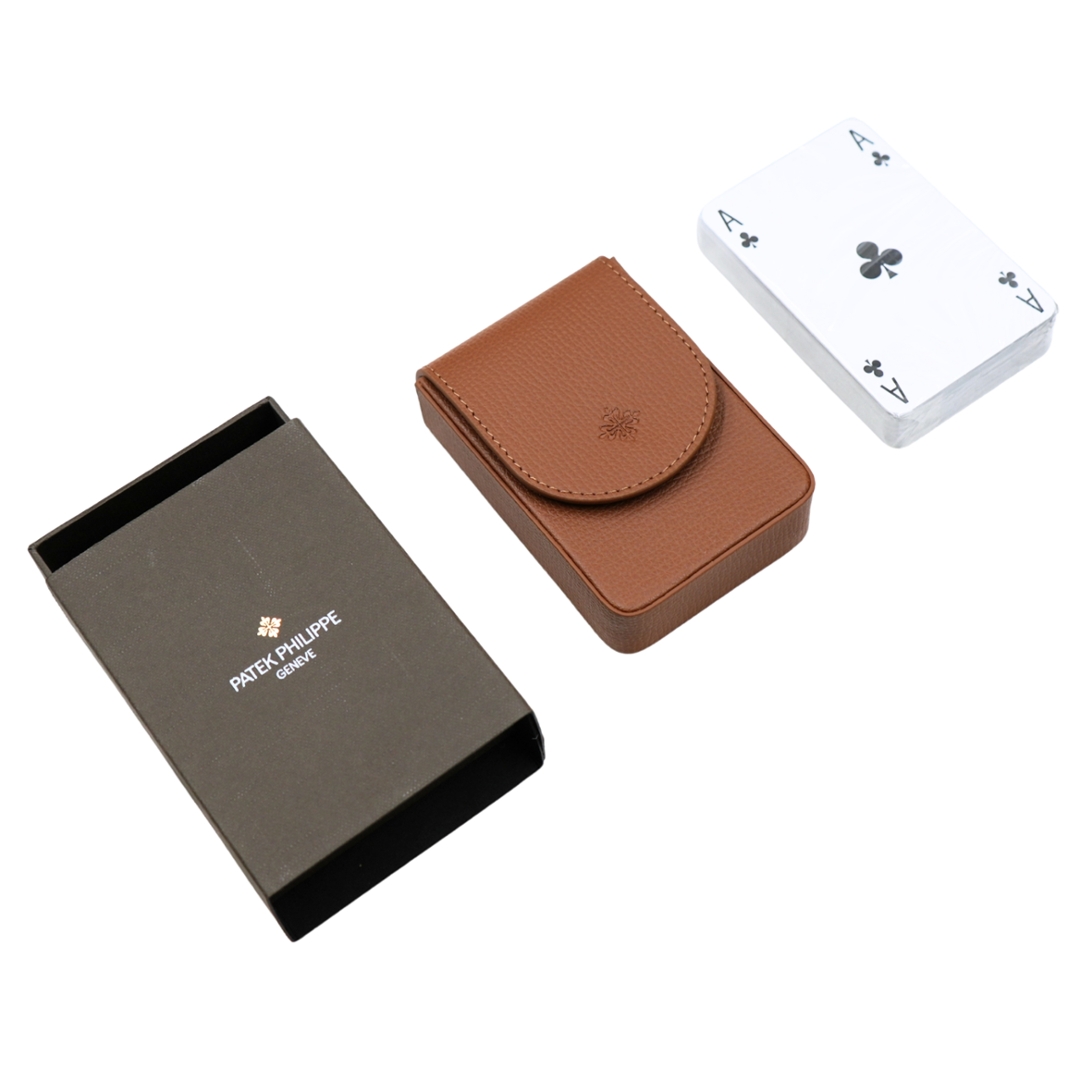 A refined Patek Philippe and playing card set, presented with its original branded leather carry case and outer packaging. This elegant accessory ensemble reflects the maison’s attention to detail beyond watchmaking, combining everyday practicality with unmistakable Geneva prestige.