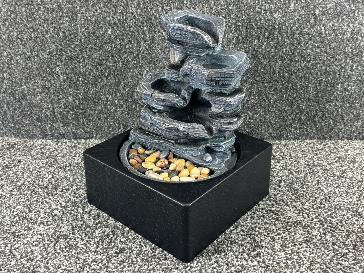 A Pebble Falls Water Fountain. Suitable for indoor and outdoor use. Approx 24cm height, 18cm width, 18cm depth.