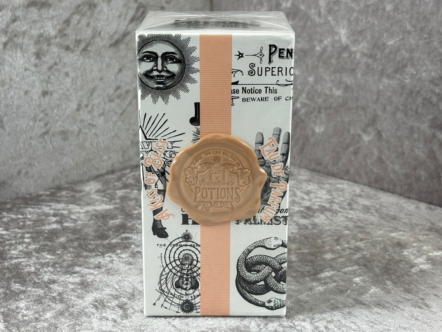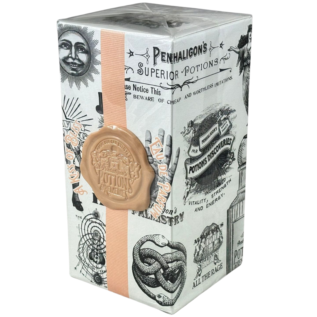 A bottle of Penhaligon's Potions & Remedies A Kiss of Bliss Eau De Parfum in a presentation box.