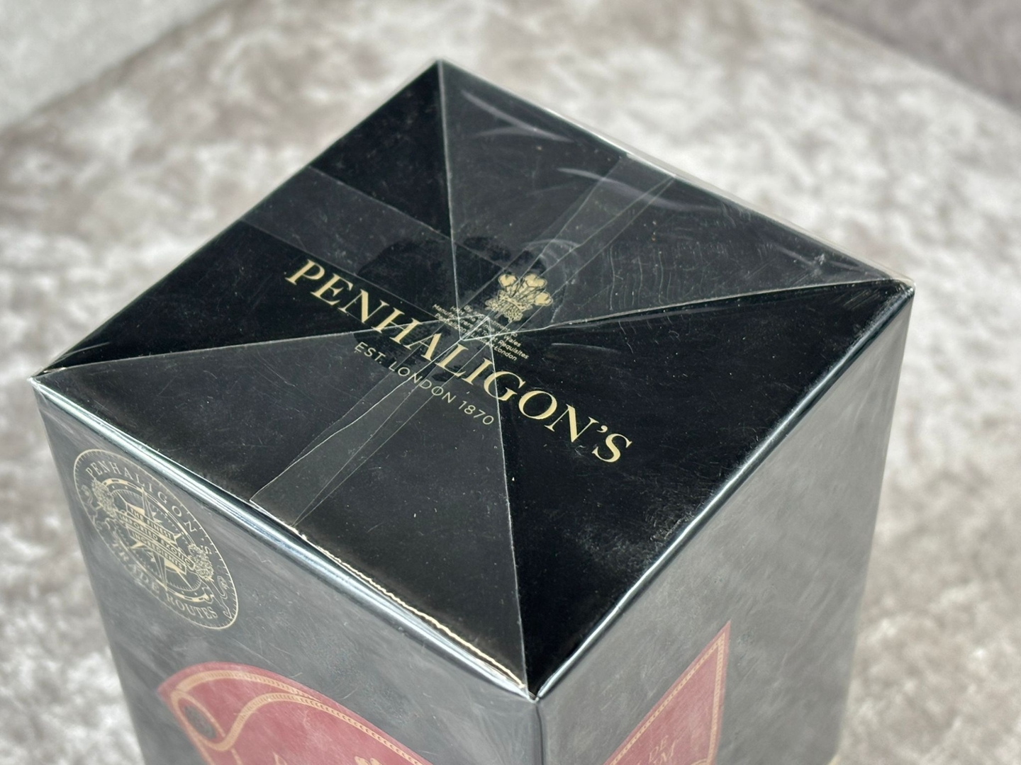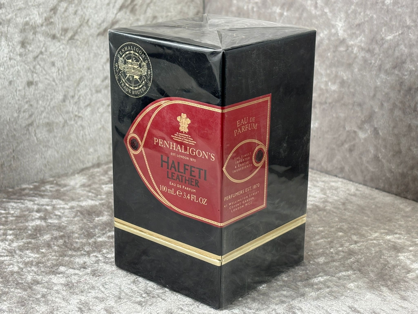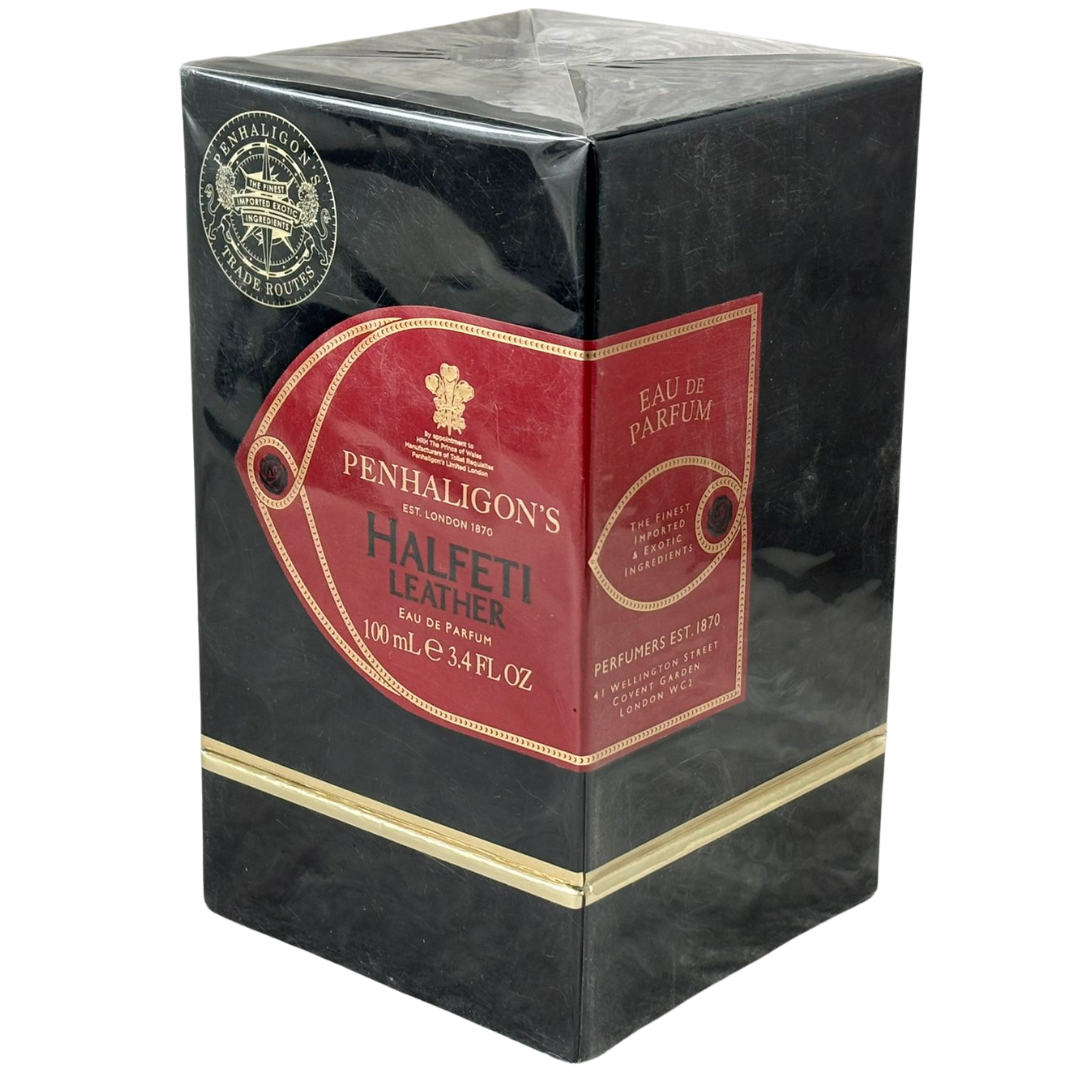 A bottle of Penhaligon's Halfeti Leather Eau De Parfum in a presentation box.