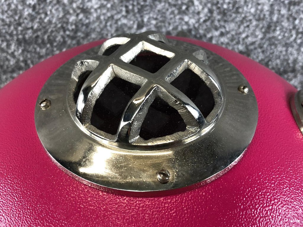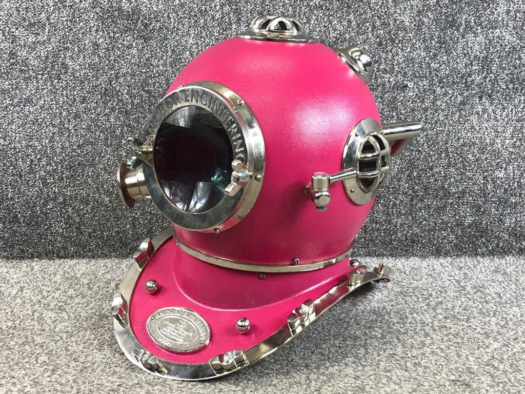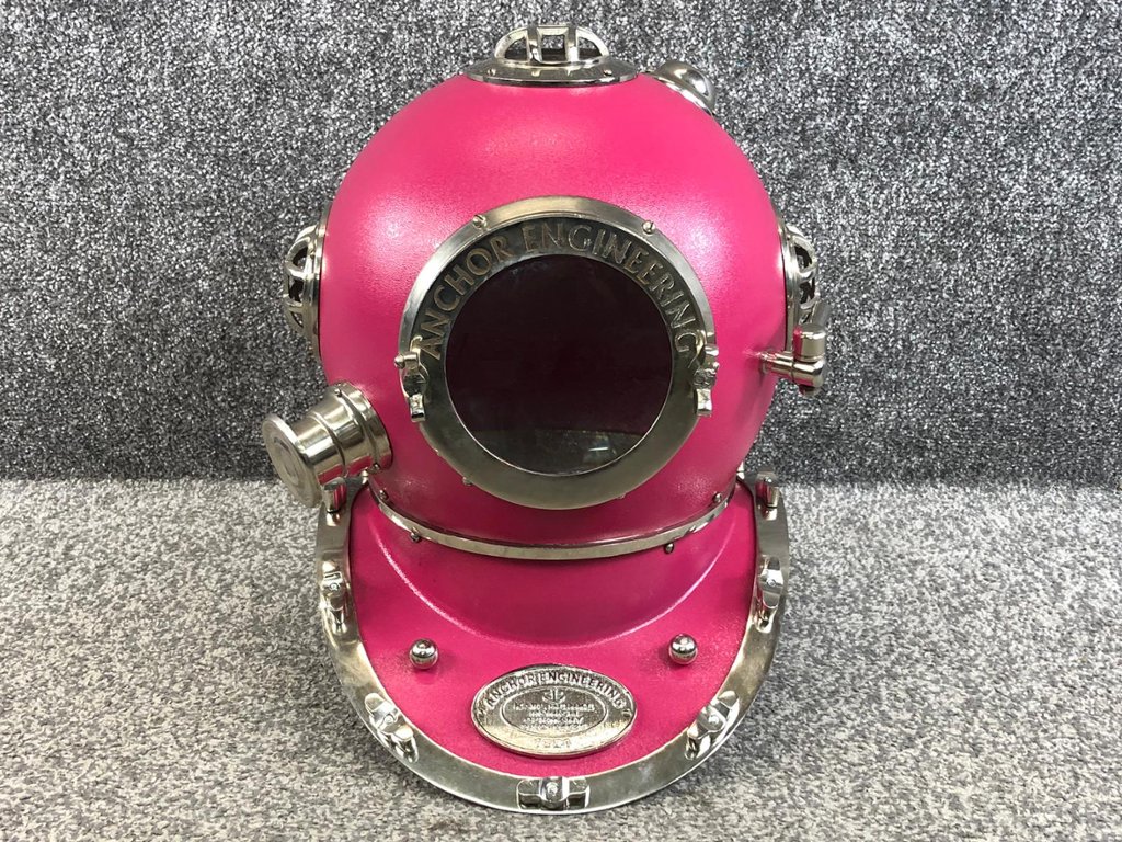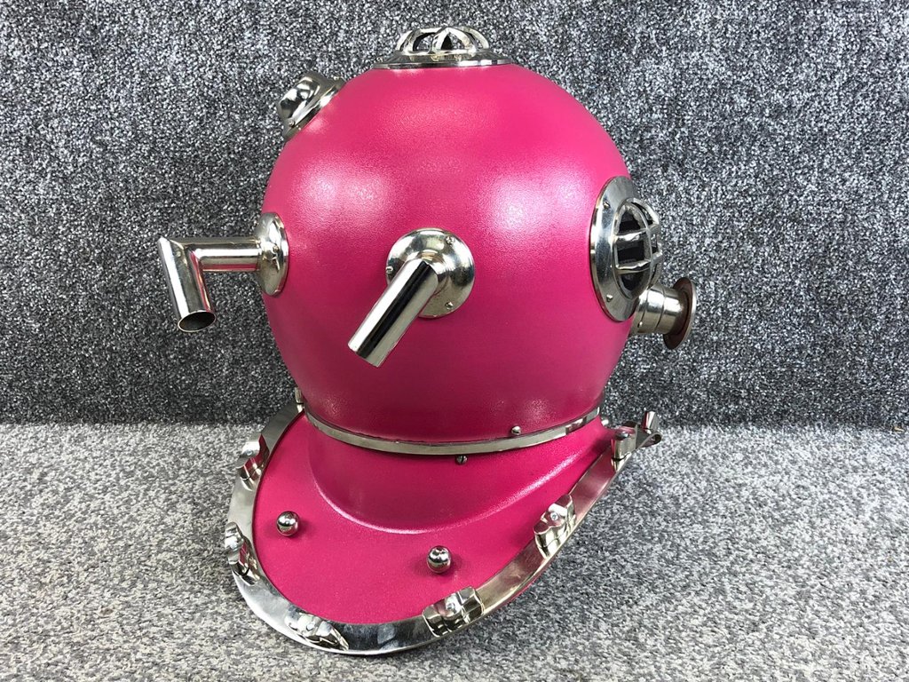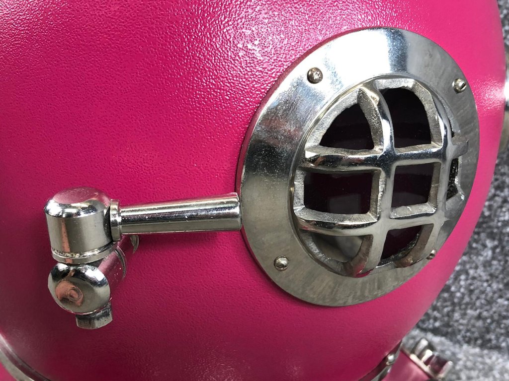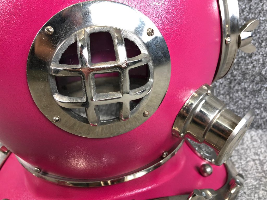 Crafted with attention to detail, the replica faithfully recreates the iconic design of a US Navy diver's helmet, complete with intricate detailing and a striking pink and chrome finish. From the authentic rivets and bolts to the classic shape and form, every aspect of the helmet is meticulously replicated to capture the essence of its real-life counterpart.