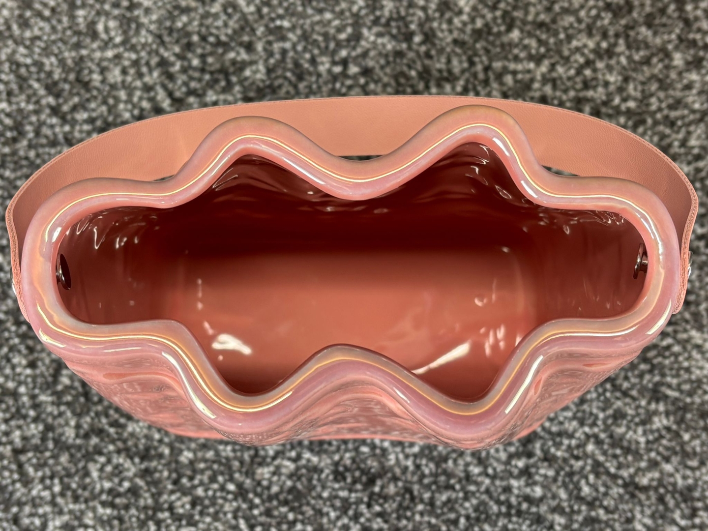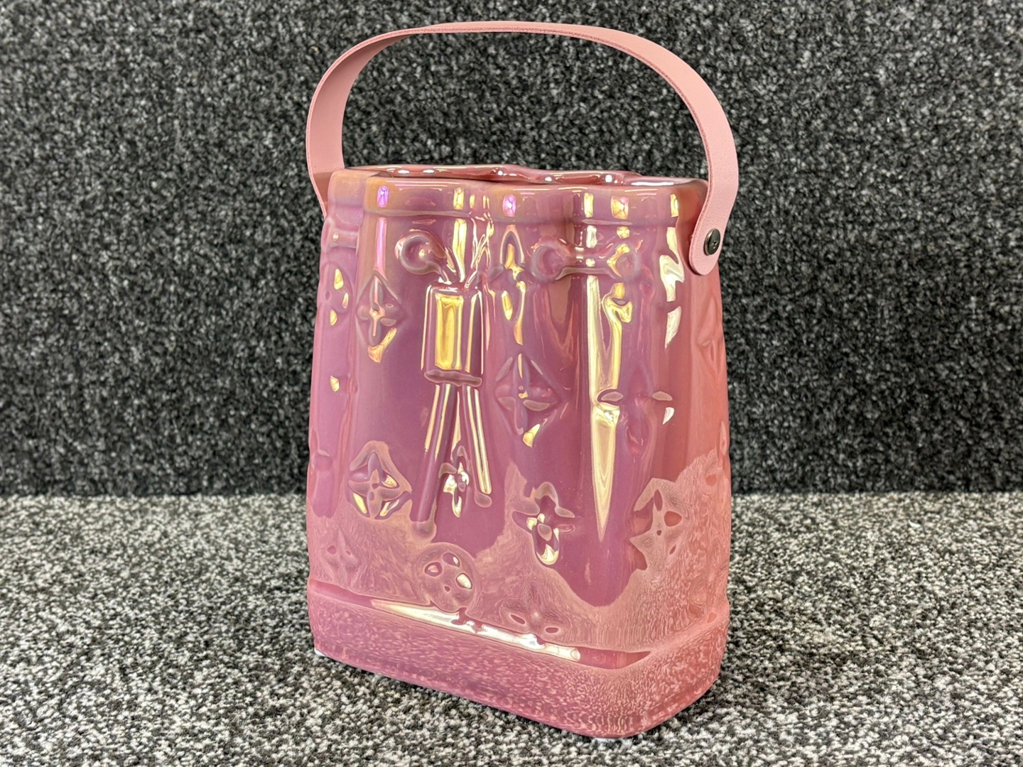 A Pink Ceramic Handbag Vase with a Pink Handle. Approx 20cm height, 15cm width, 8cm depth.
