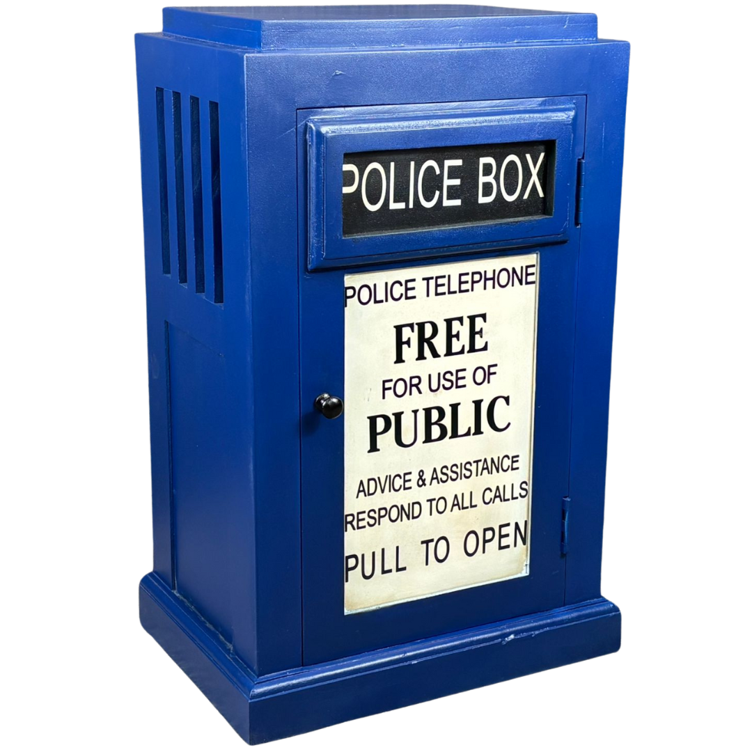 A police box style side table cabinet is a striking and characterful piece inspired by classic British pop culture design. Finished in a rich blue with authentic signage details, it instantly draws attention and adds a playful yet stylish accent to living rooms, bedrooms, offices, or themed interiors.