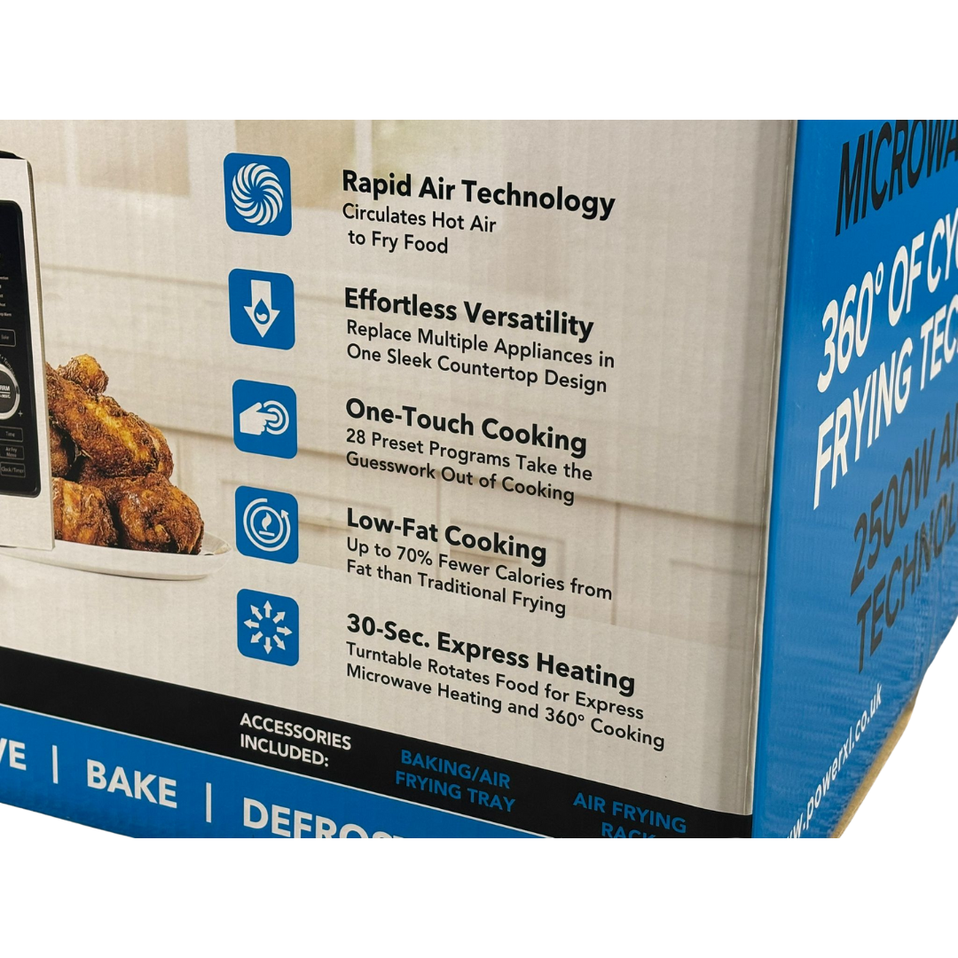 A Power XL Microwave Air Fryer & Oven – the ultimate 5-in-1 family-sized kitchen essential. Combining the power of a microwave, air fryer, oven, grill, and defroster, this 28L appliance revolutionises your countertop with incredible versatility and speed. It's 2500W 360° Cyclonic Air Fry Technology circulates hot air for crisp, golden results using little to no oil, letting you enjoy your favourite fried foods guilt-free.