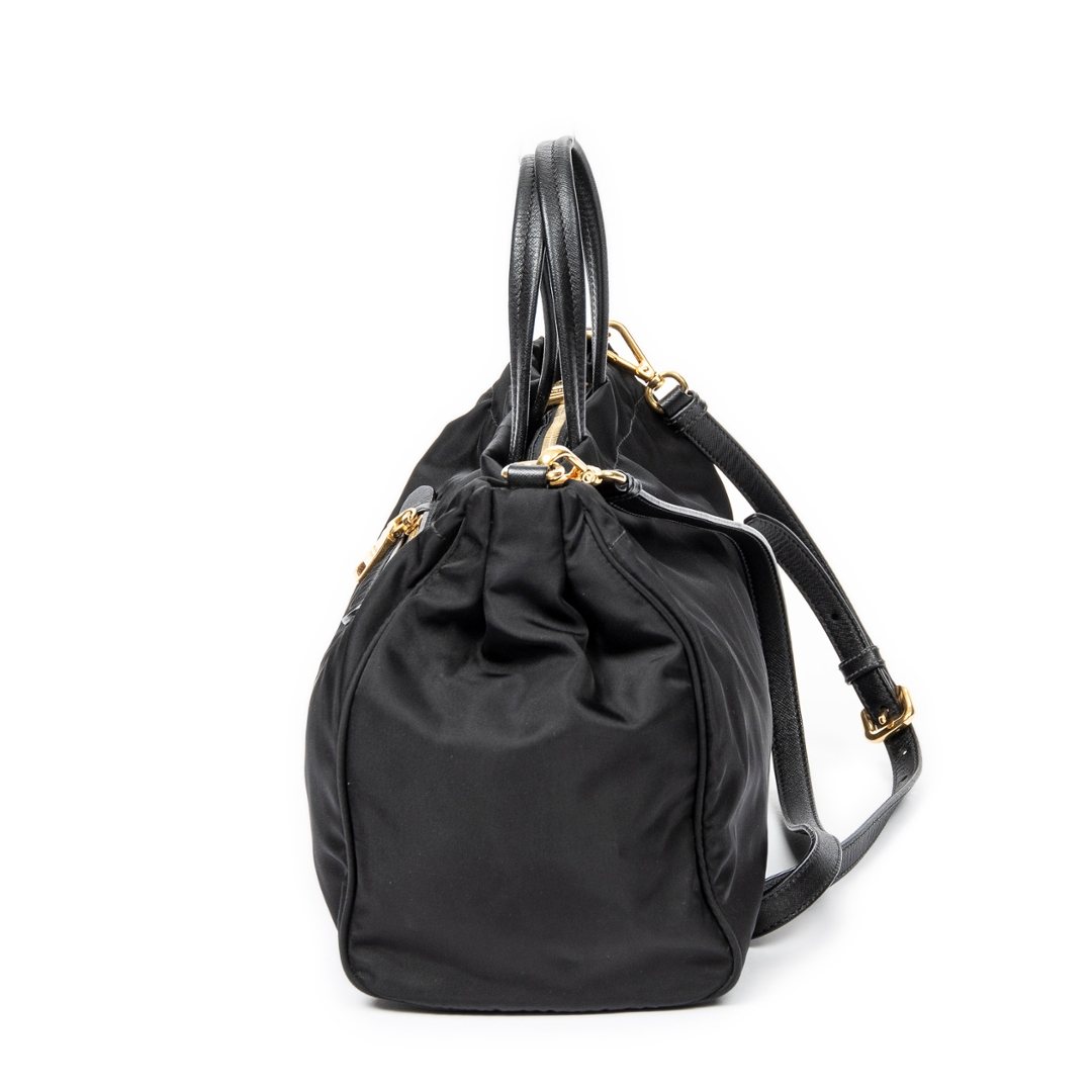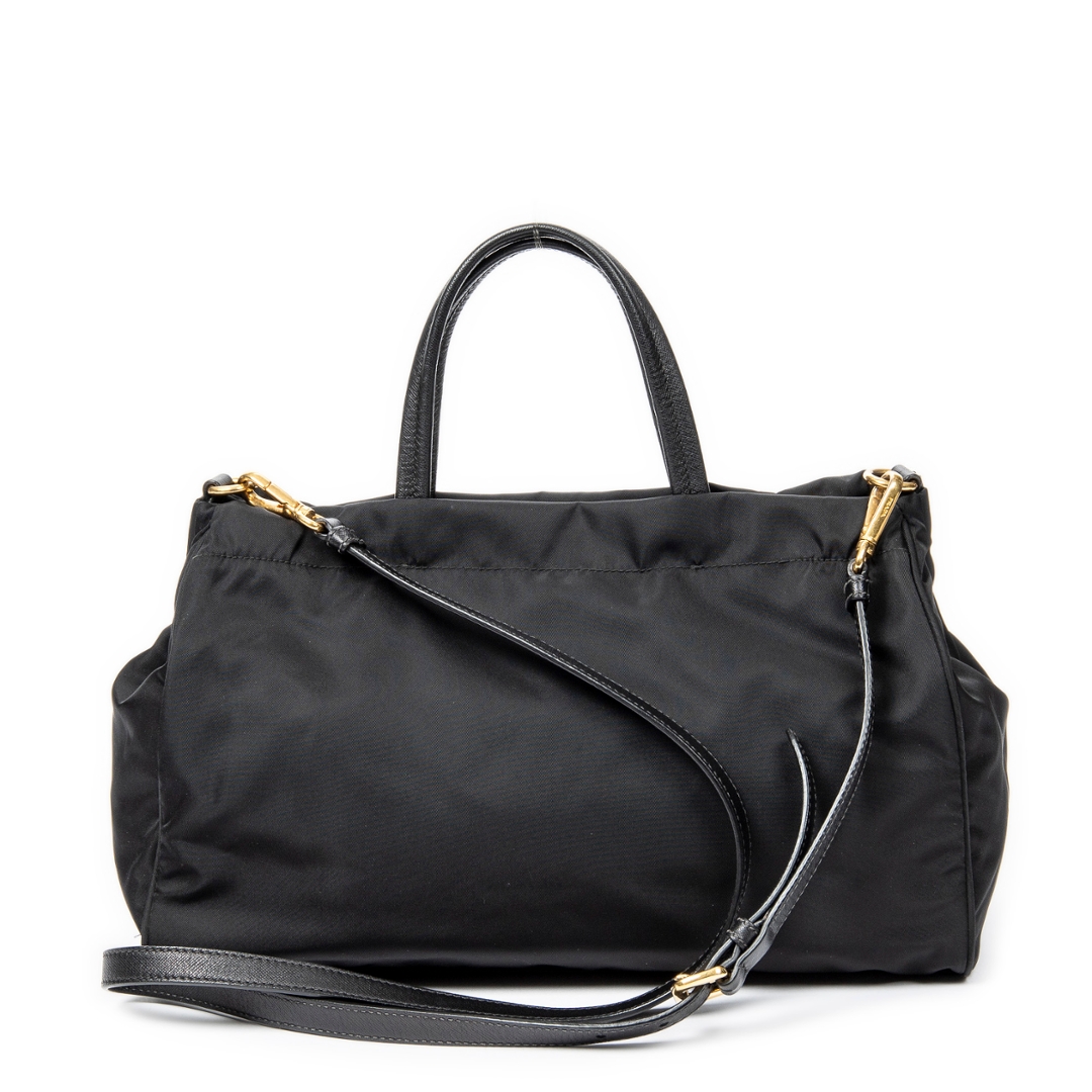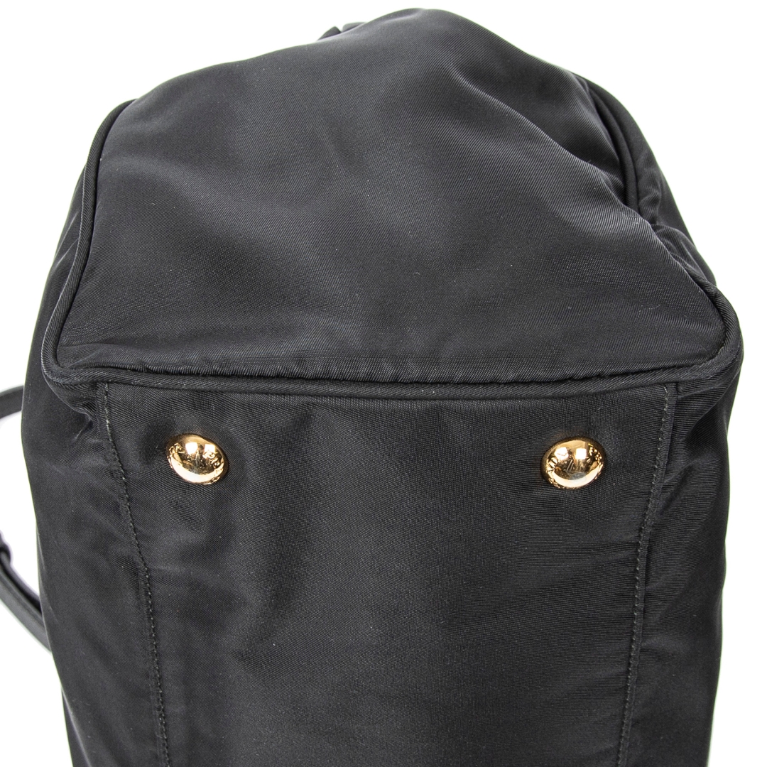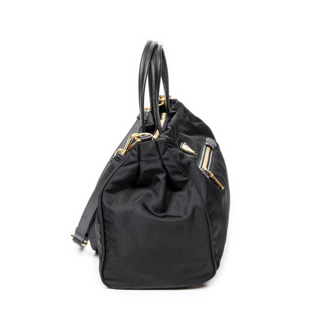 A vintage Prada black canvas 2 Way Zip Tote bag with a certificate of authenticity. Approximately 22cm height, 34cm width.