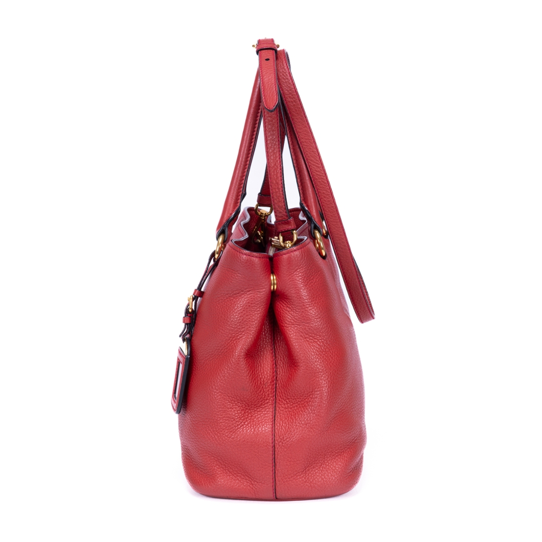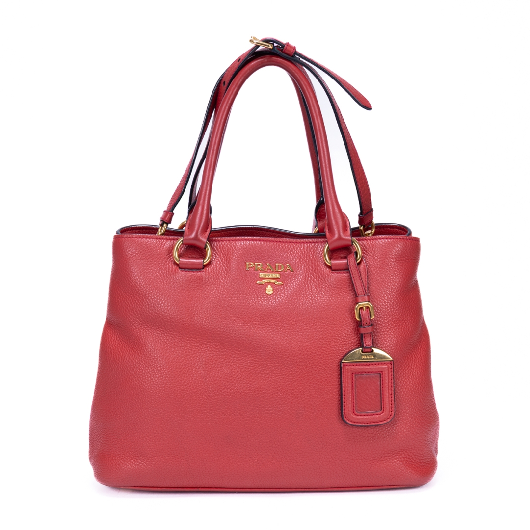 A vintage Prada red calf leather Cabas Crossbody Tote bag with a certificate of authenticity. Approximately 23cm height, 31cm width.