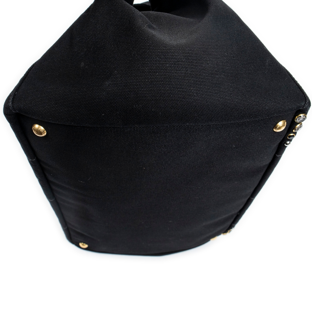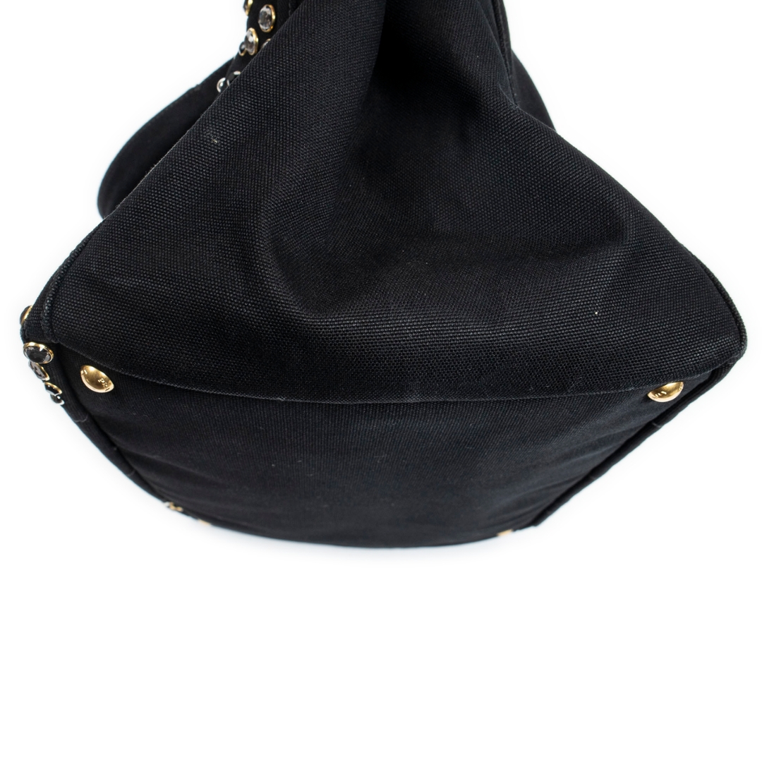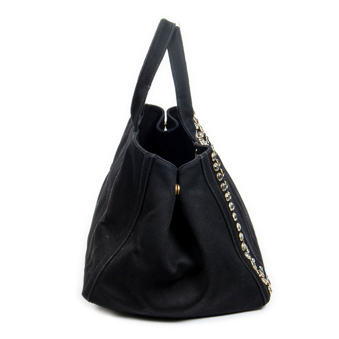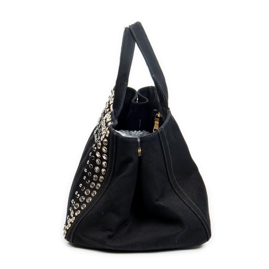 A vintage Prada black canvas Large Rhinestone Canapa Tote bag with a certificate of authenticity, Approximately 24cm height, 40cm width.