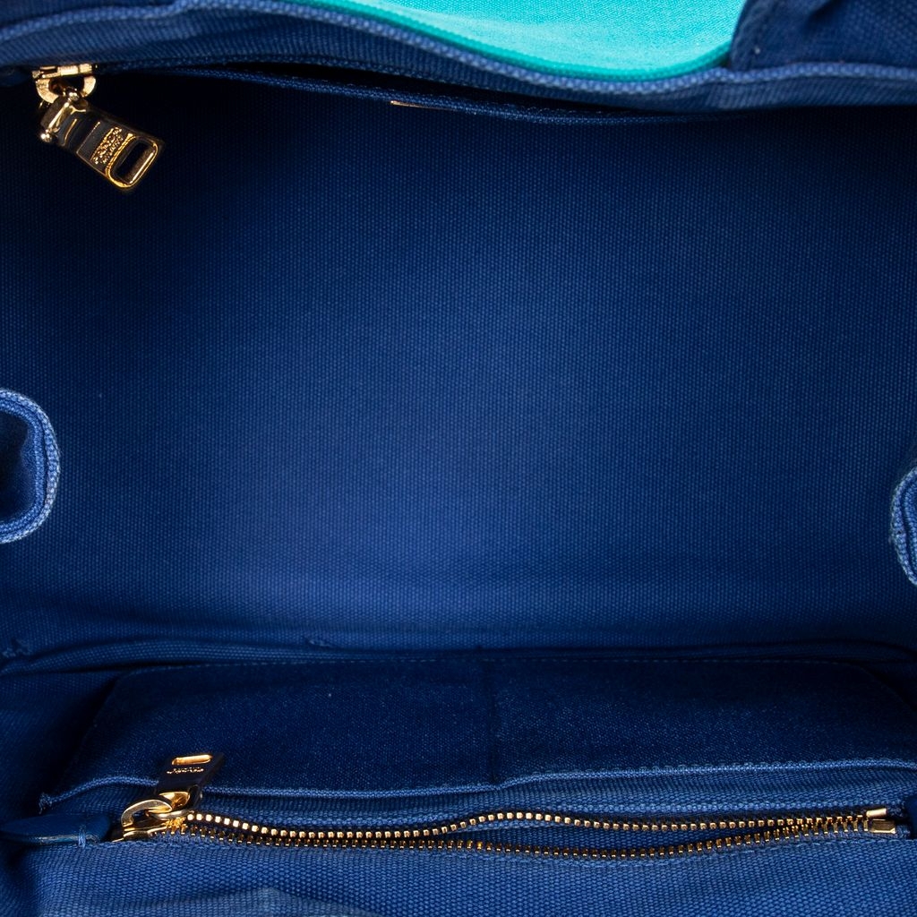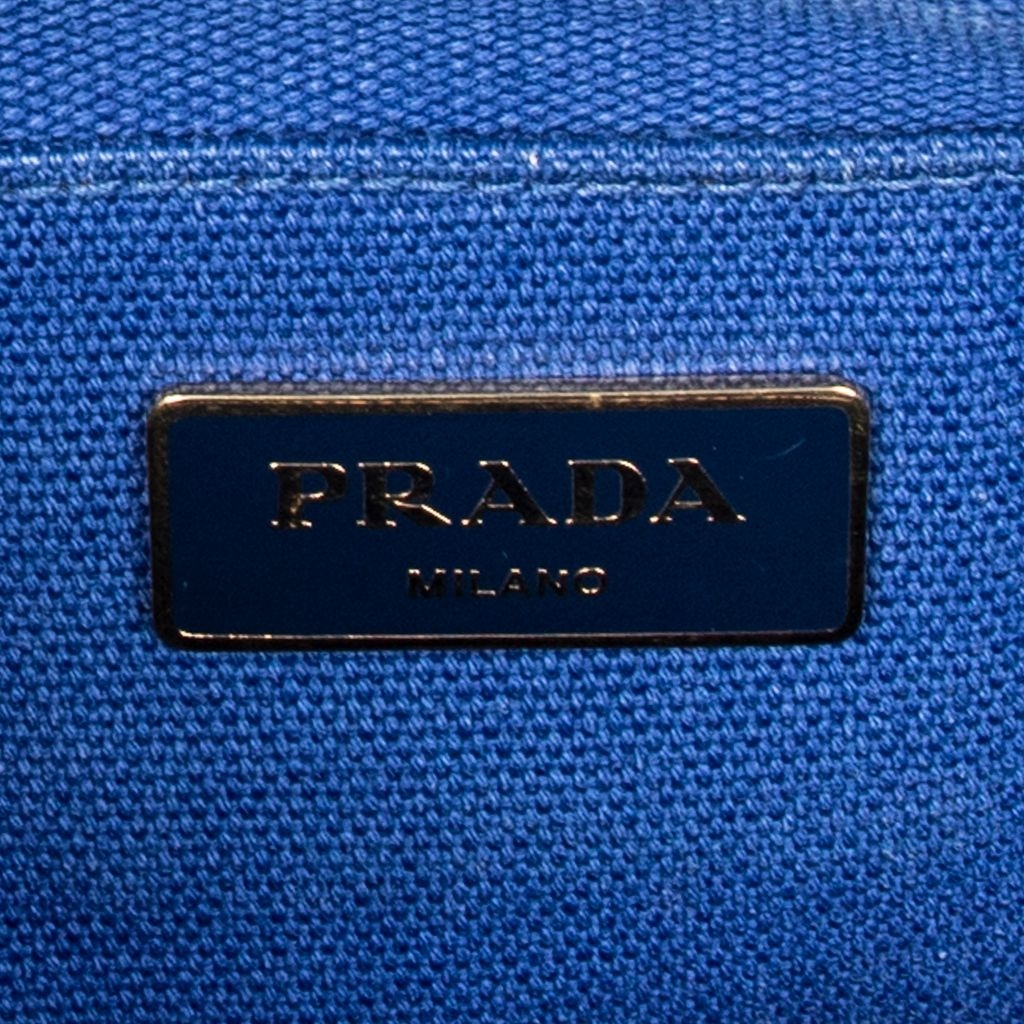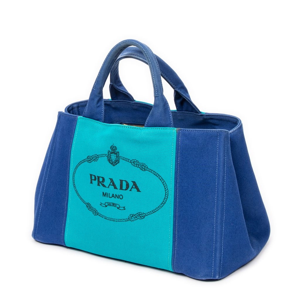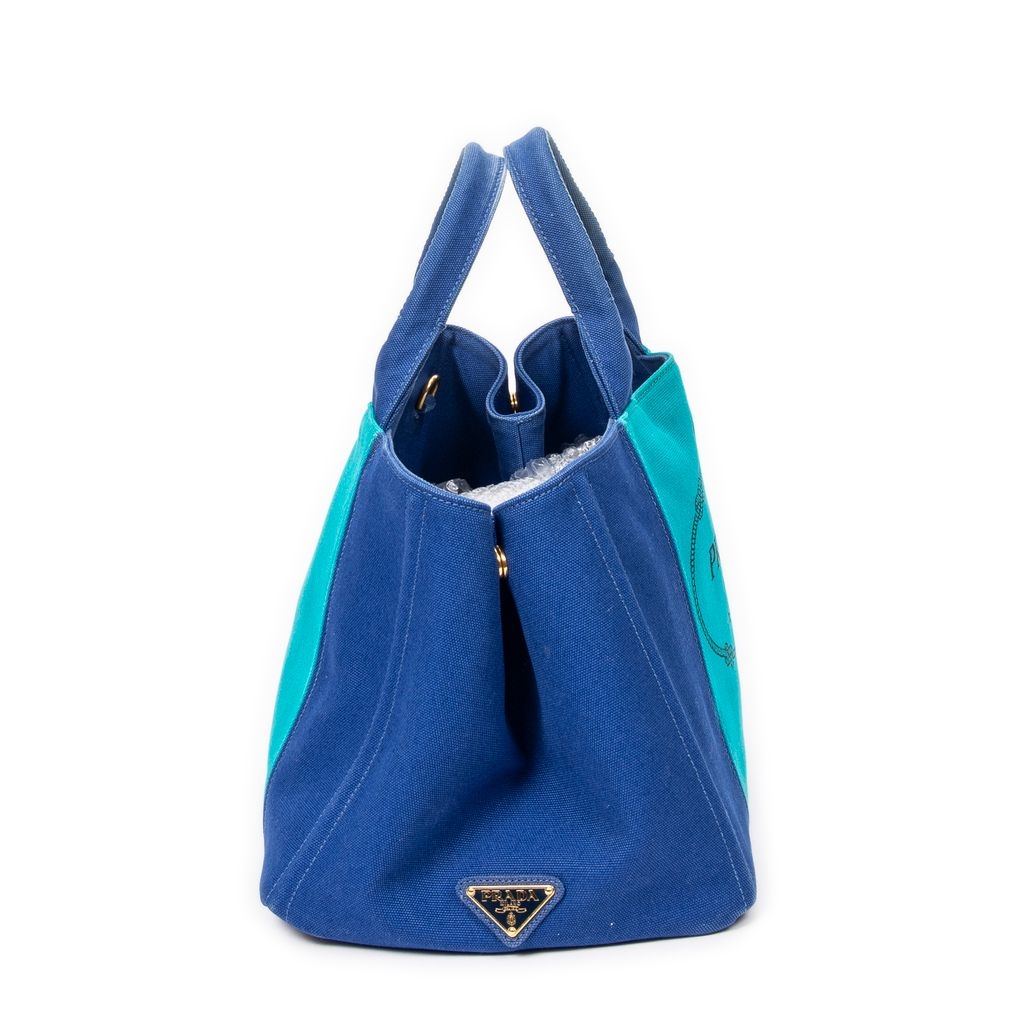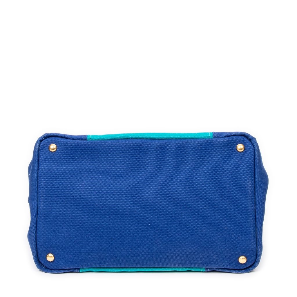 A vintage Prada royal blue/teal canvas Medium Bicolor Canapa Tote bag with a certificate of authenticity, Approximately 23cm height, 35cm width.