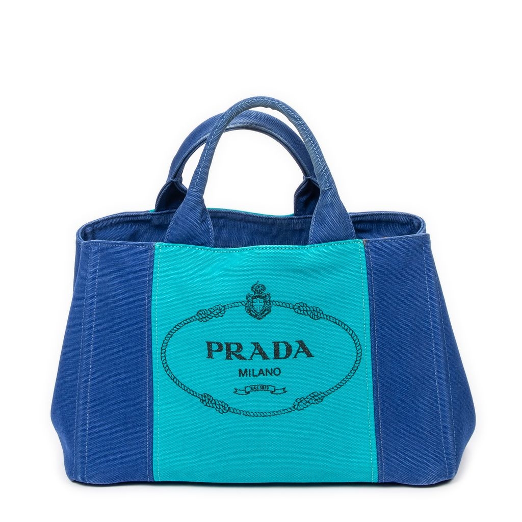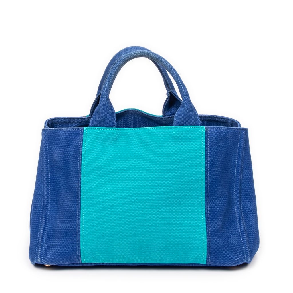 A vintage Prada royal blue and teal canvas Medium Bicolour Canapa Tote bag with a certificate of authenticity. Crafted from Prada’s durable canapa canvas, this bold yet refined design features a striking two-tone colourway and prominent Prada Milano branding on the front. The structured silhouette is finished with sturdy top handles and reinforced edges, offering a clean and contemporary aesthetic. Measuring approximately 23cm in height and 35cm in width, it provides a practical and well-proportioned everyday tote.
