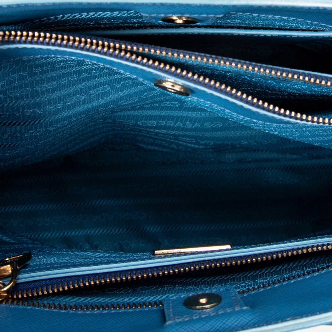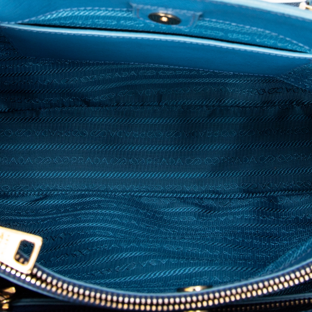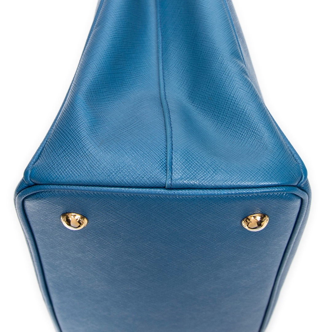 A vintage Prada blue calf leather Medium Galleria Tote bag with a certificate of authenticity. Approximately 23cm height, 33cm width.